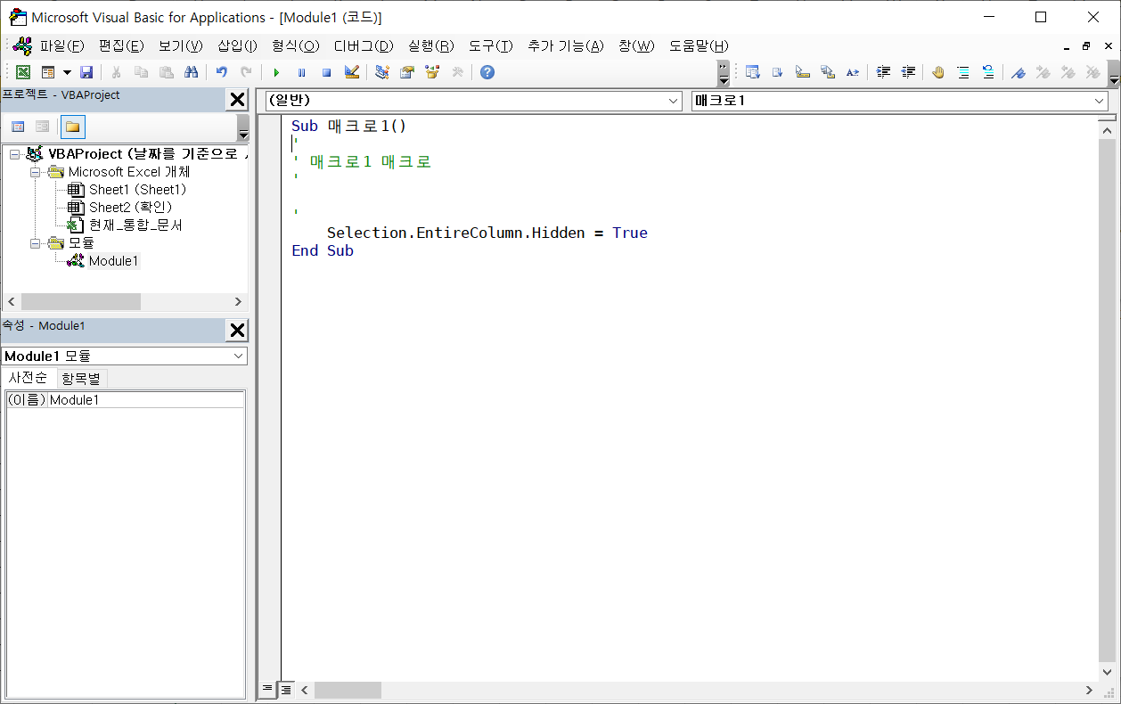 열을 숨기려면 어떤 코드를 써야 하는지 알아보기 위해 매크로를 하나 만듭니다.