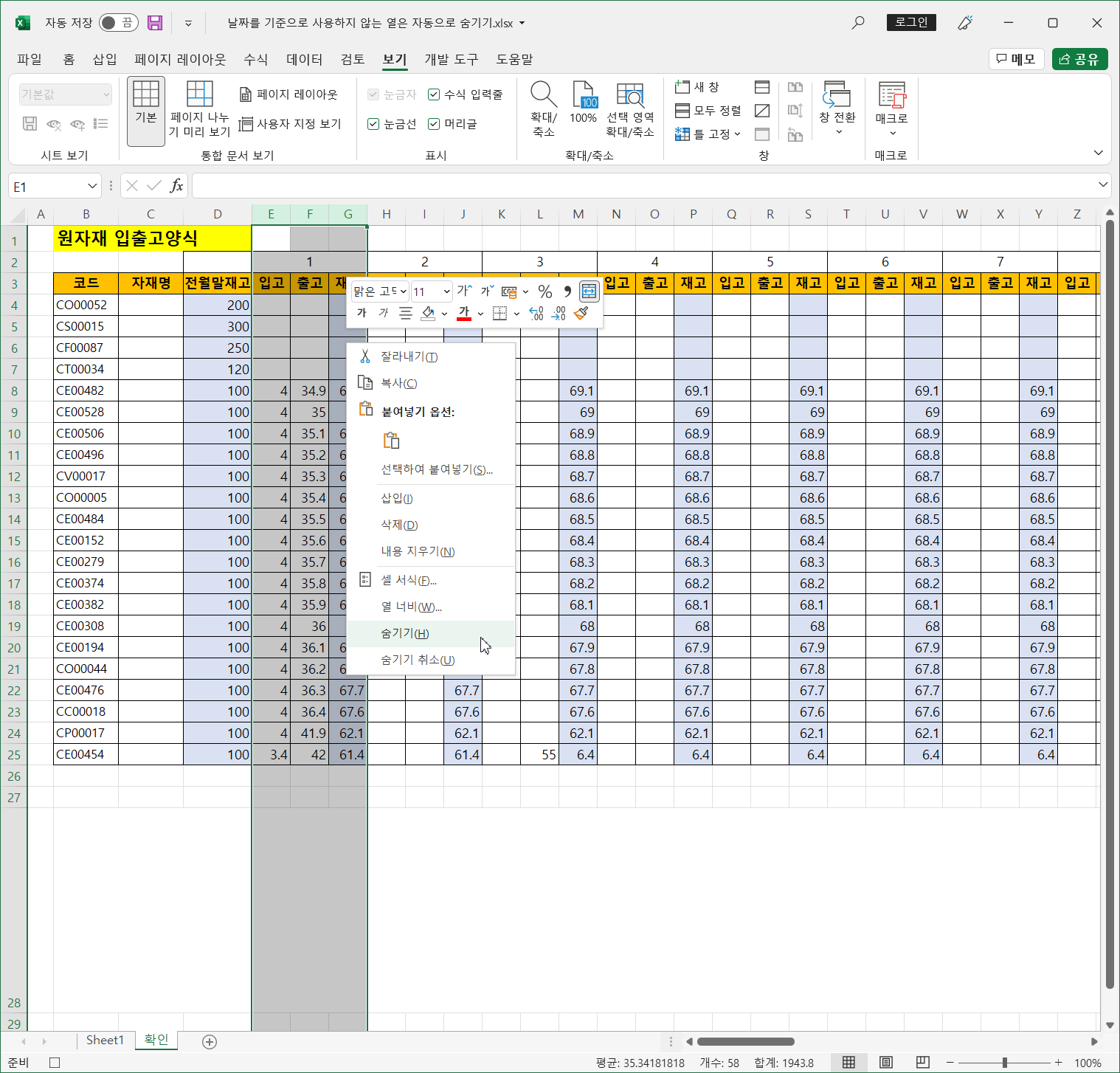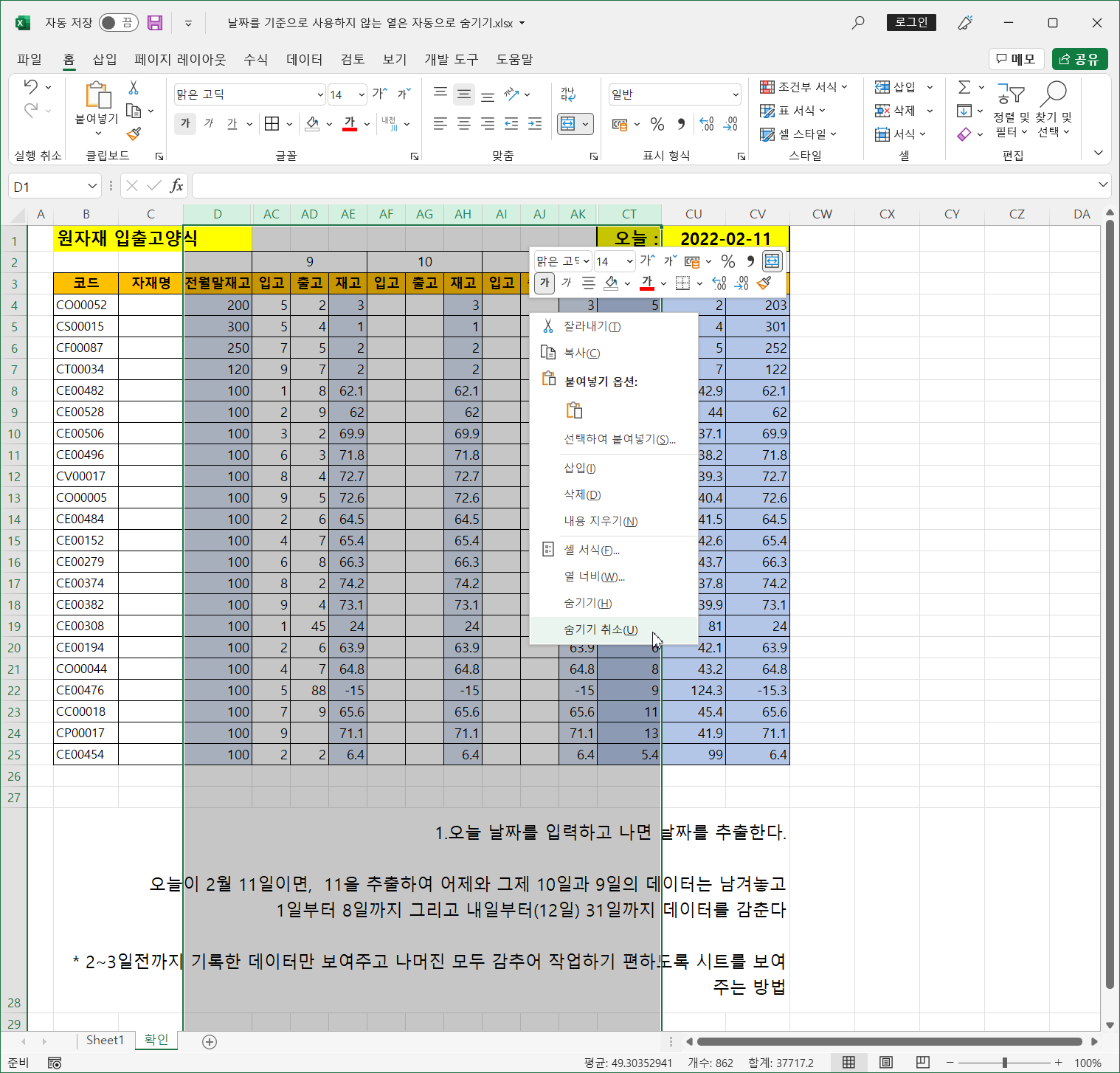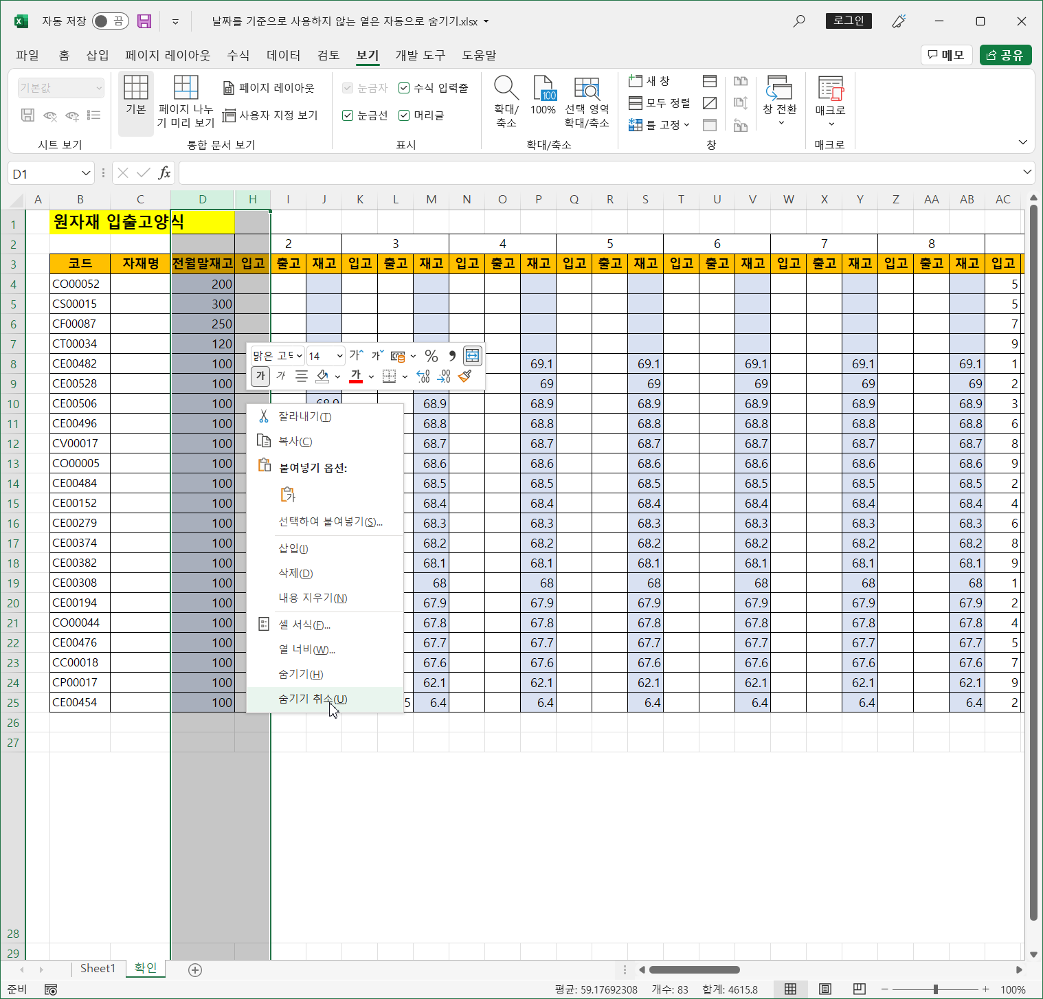 '확인' 시트에서 D열부터 CT열까지 범위를 선택해서 마우스 오른쪽 클릭해서 '숨기기 취소'를 선택합니다.