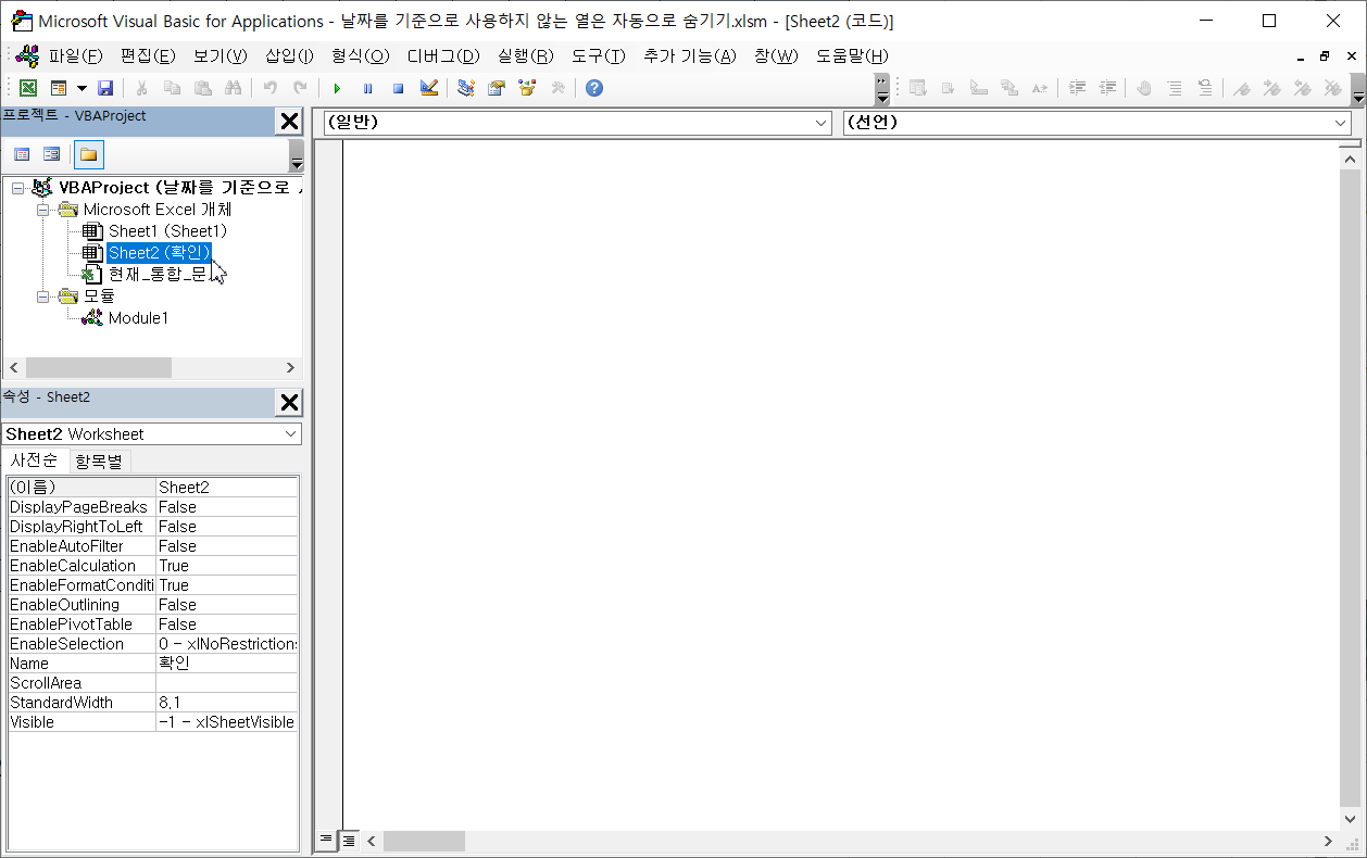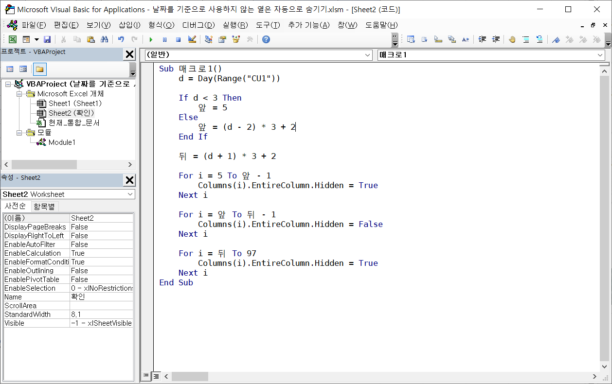 다음 달은 현재 시트를 복사해서 쓰려고 하는데, 현재 코드가 작성된 곳은 모듈(Module)입니다.