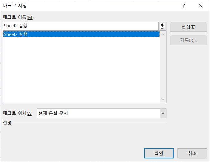 VBA가 실행되는 것에는 영향을 미치진 않지만 알아보기 쉽도록 매크로 이름을 '매크로1'에서 '실행'으로 바꿉니다.
