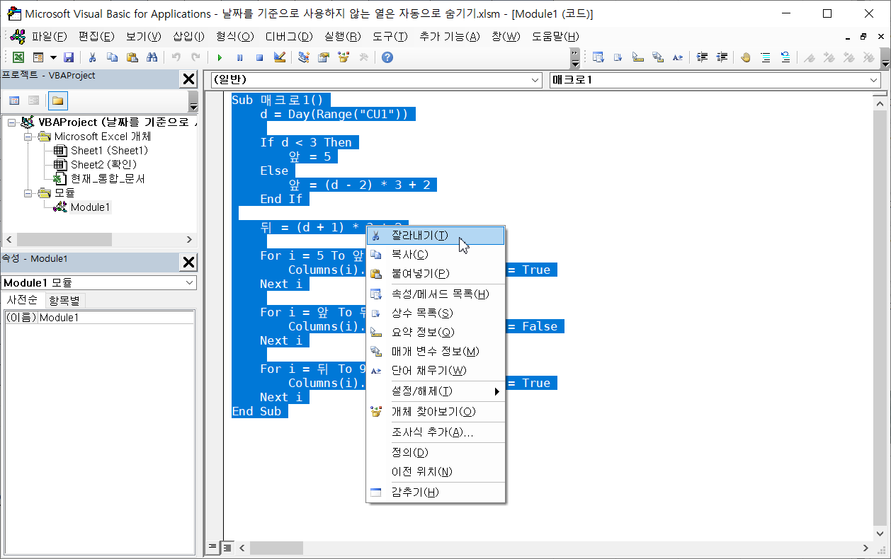 모듈에 작성한 코드를 모두 범위 선택해서 '잘라내기'를 선택합니다.