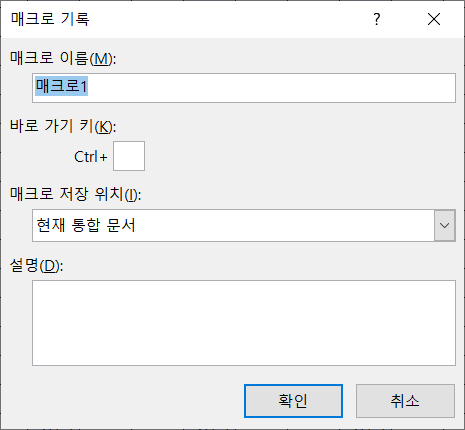 코드를 확인하기 위한 목적으로 만드는 것이 때문에 [매크로 기록] 대화상자에 표시되는 내용을 바꾸지 않고 그대로 [확인]을 클릭합니다.