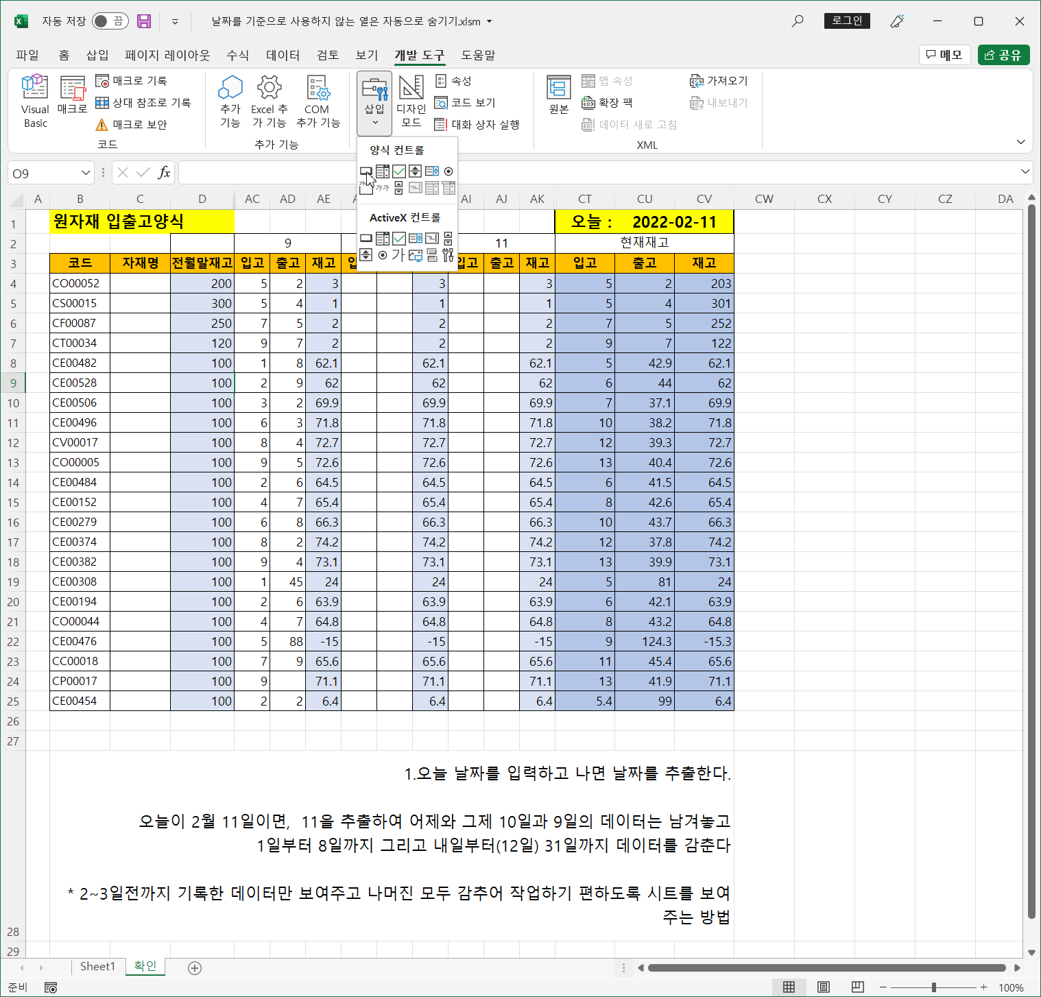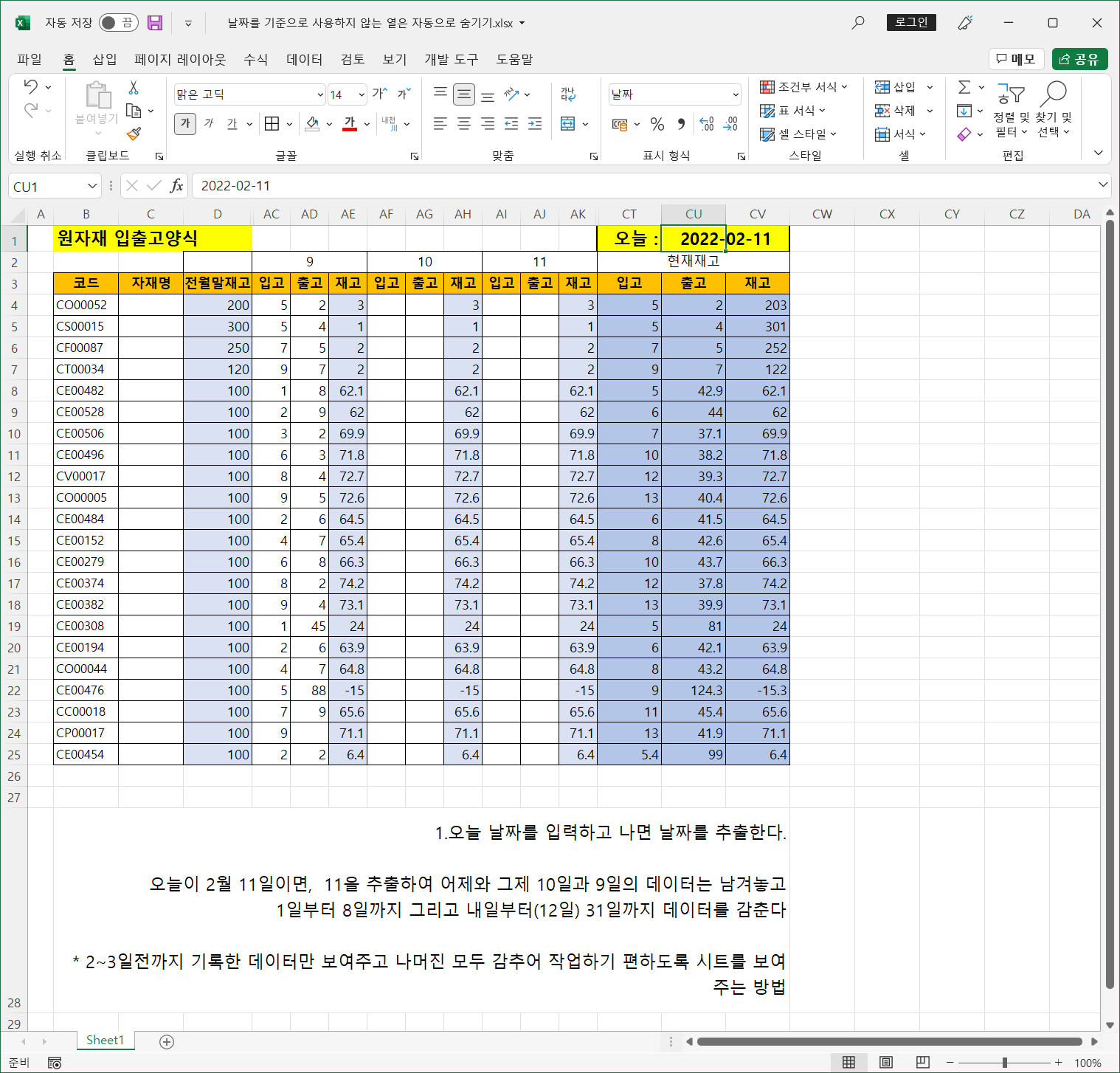 [CU1] 셀에 TODAY 함수로 오늘 날짜가 자동으로 나오도록 되어 있었는데, 설명을 위해 '2022-02-11'로 직접 입력했고, CT, CU 열 수식을 SUMIF 함수로 바꿨습니다.