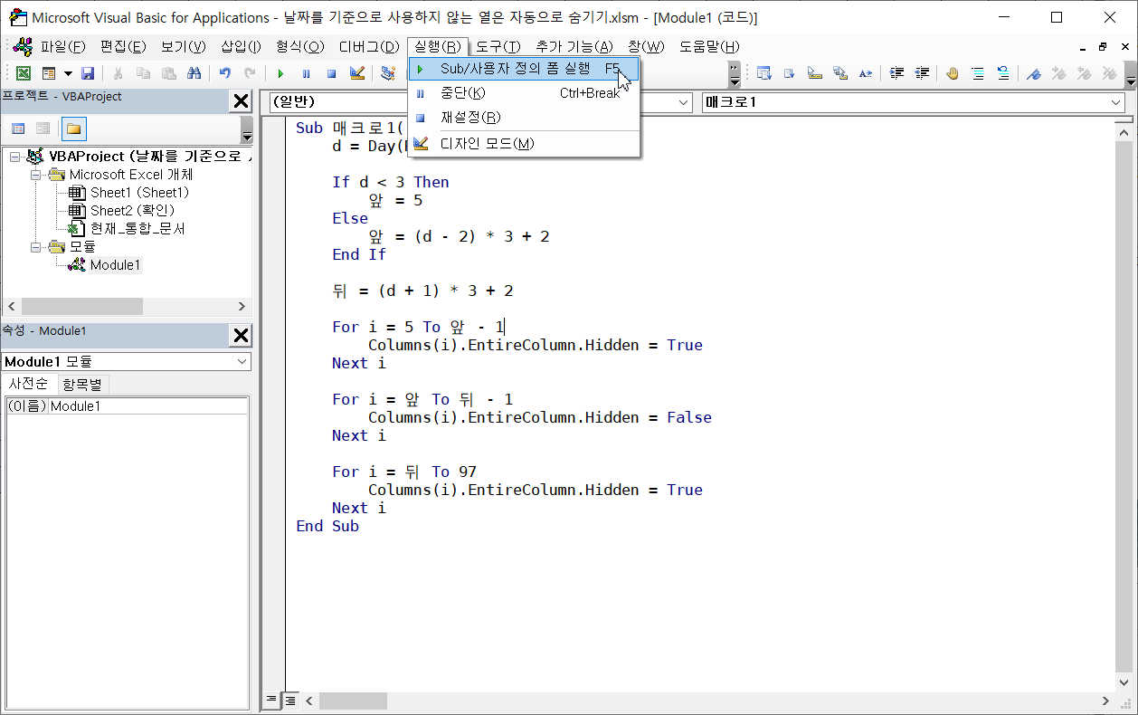 이제 [실행]-[실행]을 선택하거나 <F5>를 눌러 코드를 실행합니다.