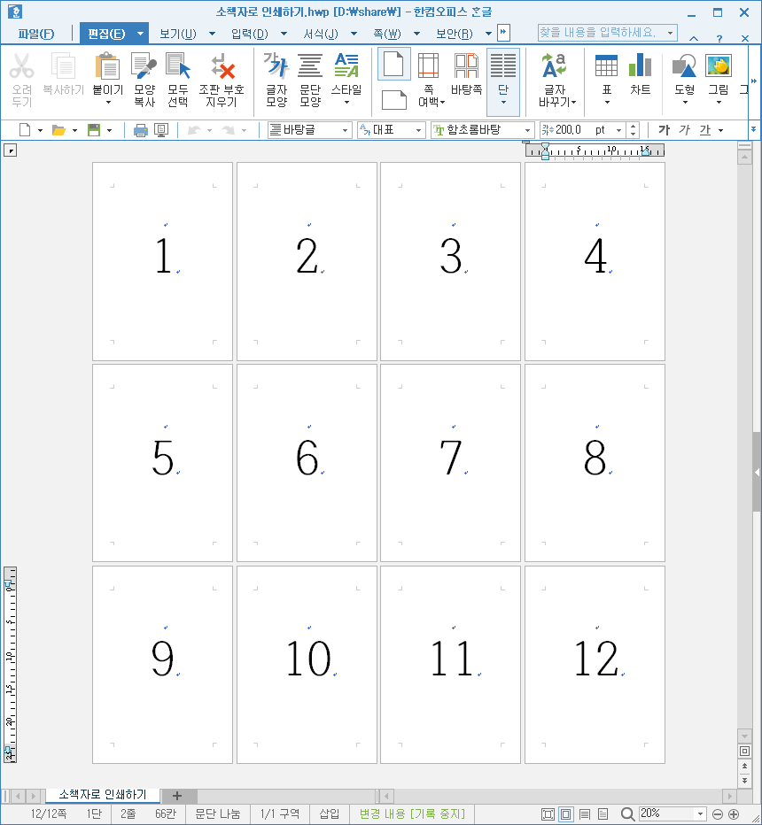 [소책자 모양으로 찍기] 기능을 써 보기 위해 총 12쪽 문서를 실습 파일로 만들었습니다.