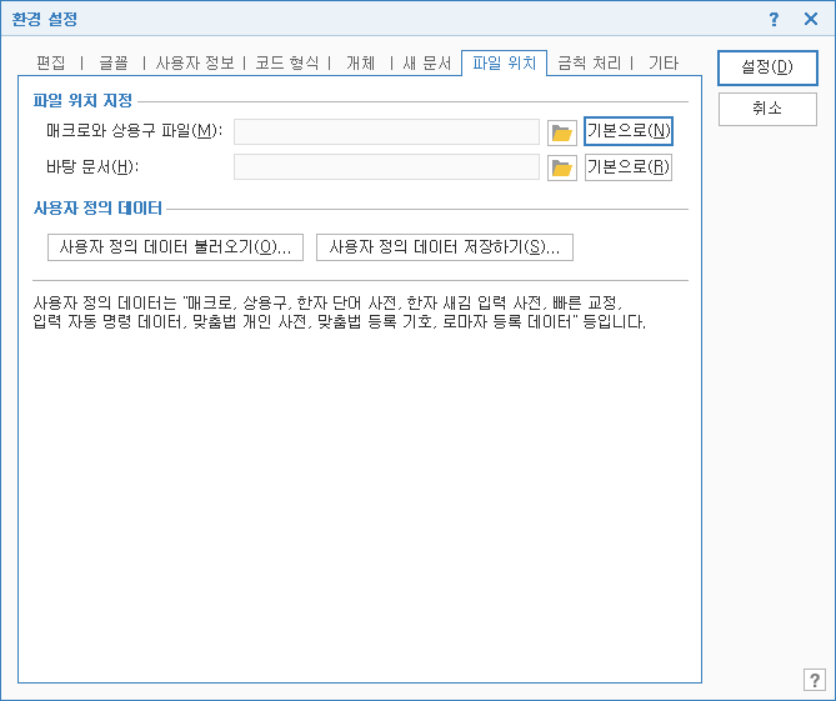 파일 위치 탭 '매크로와 상용구 파일'에 경로를 지정할 수 있습니다.