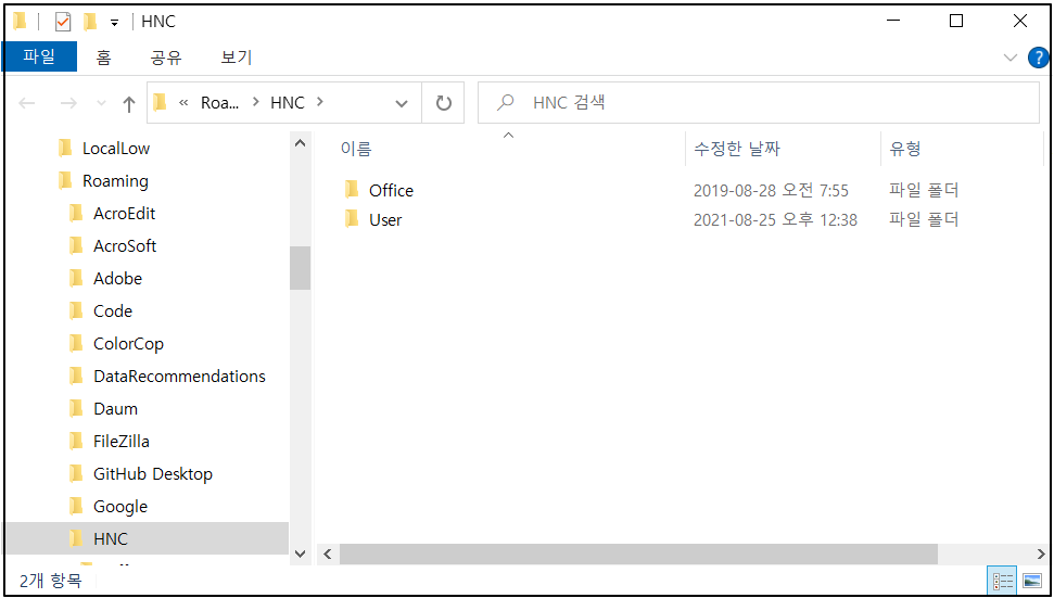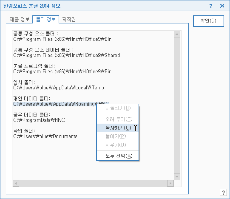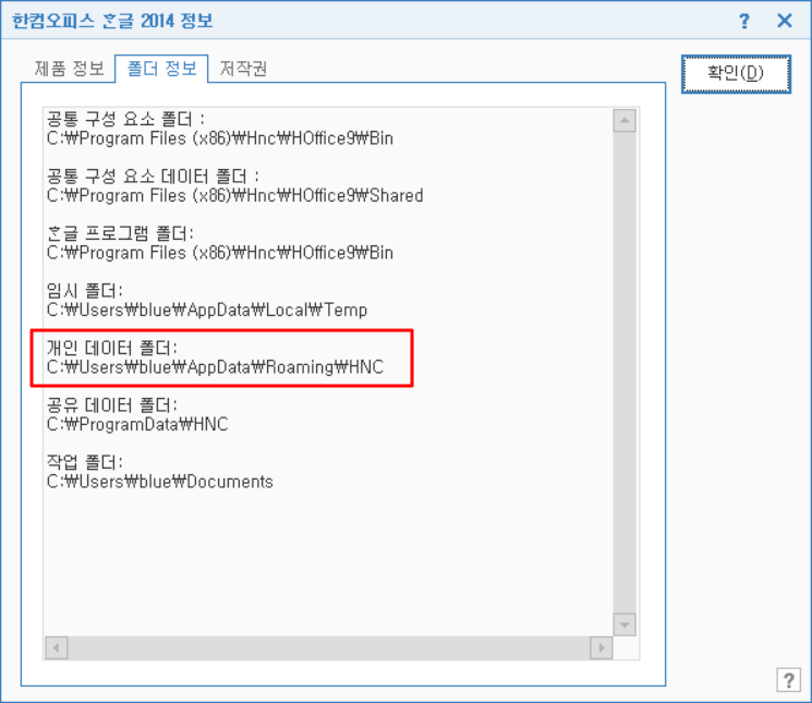 개인 데이터 폴더 경로 C:\Users\blue\AppData\Roaming\HNC 중 blue는 로그인한 사용자 이름을 나타내는 것으로 컴퓨터마다 다릅니다.