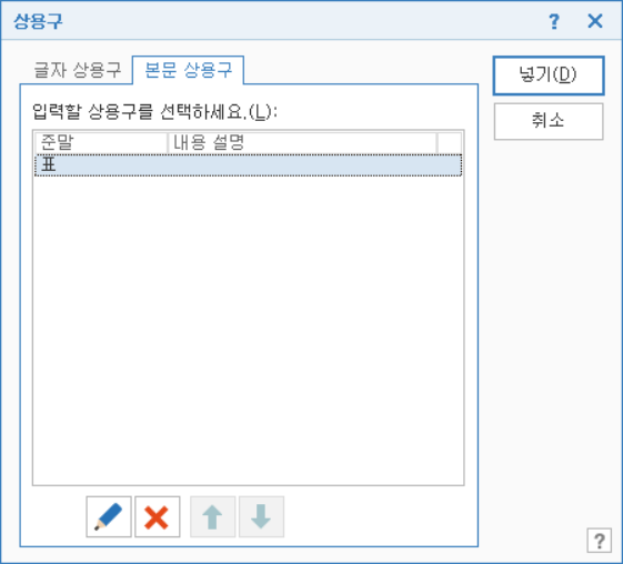 <Ctrl + F3>을 눌러 [상용구] 대화상자를 실행해 현재 등록된 상용구 목록을 확인할 수 있습니다.