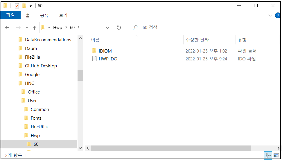 하위 폴더인 User\Hwp\60 폴더로 이동합니다.