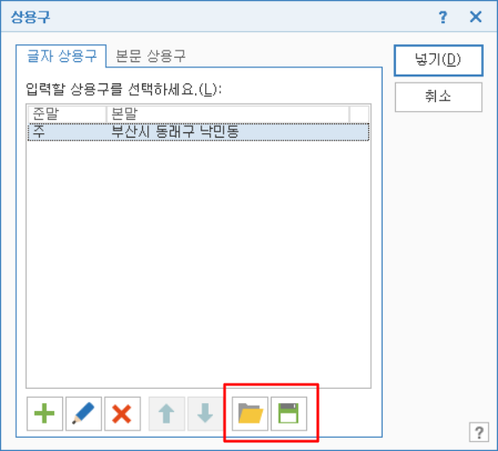 글자 상용구 탭에는 '글자 상용구 불러오기'와 '글자 상용구 저장하기'가 있어 현재 컴퓨터의 상용구를 다른 컴퓨터에서 불러와서 사용할 수 있습니다.