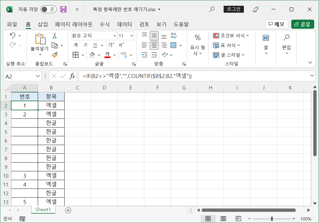 항목이 '엑셀'인 경우에만 번호가 나타나도록 IF, COUNTIF 함수를 이용해 나타냅니다.