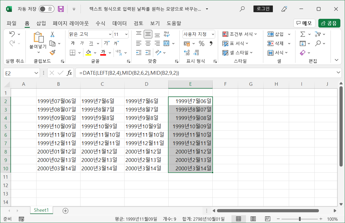 E열 데이터는 날짜 형식이므로 수식을 이용하지 않고 표시 형식으로 앞으로 언제든 원하는 모양으로 바꿀 수 있습니다.