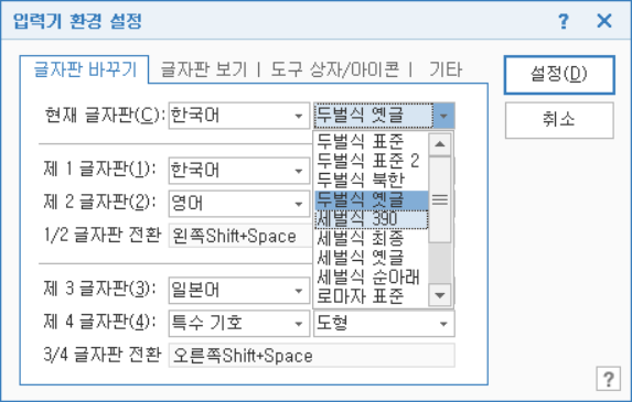 '현재 글자판'에서 '두벌식 표준' 대신 '두벌식 옛글'을 선택하고 [설정]을 클릭합니다.