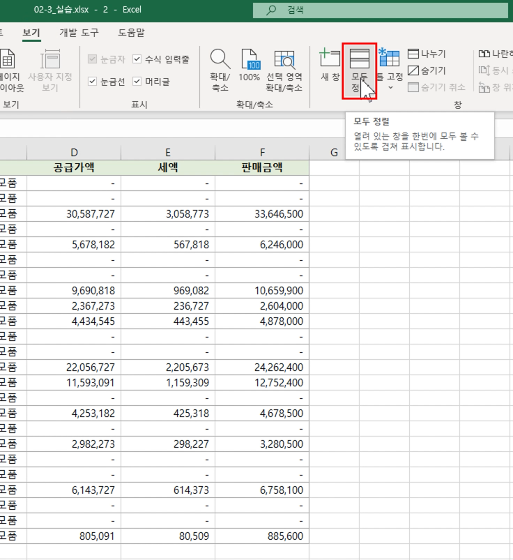 [보기] 탭 - [모두 정렬]을 선택합니다. [창 정렬] 대화 상자에서 '세로' 정렬을 선택하고 [확인]을 누릅니다.