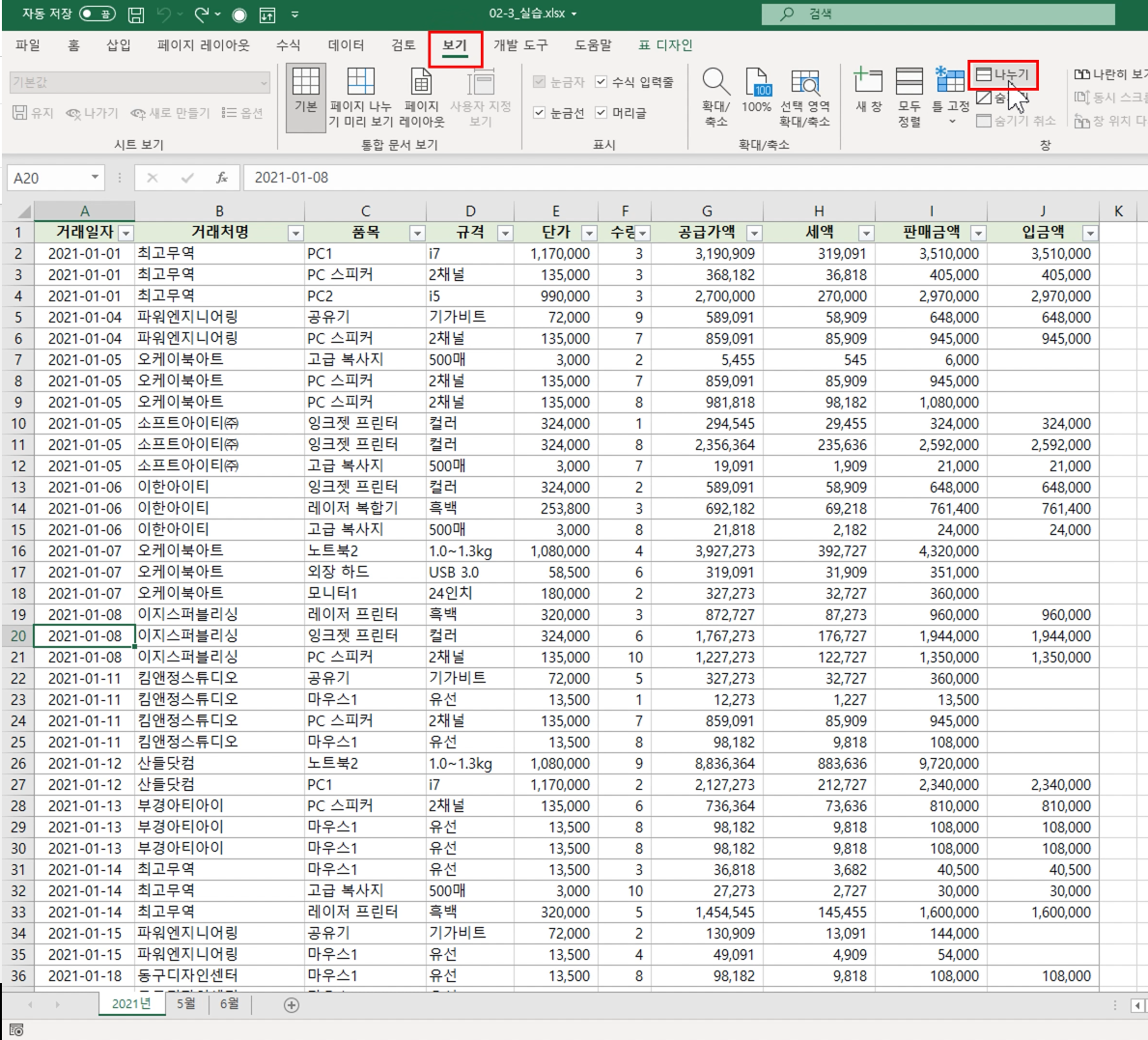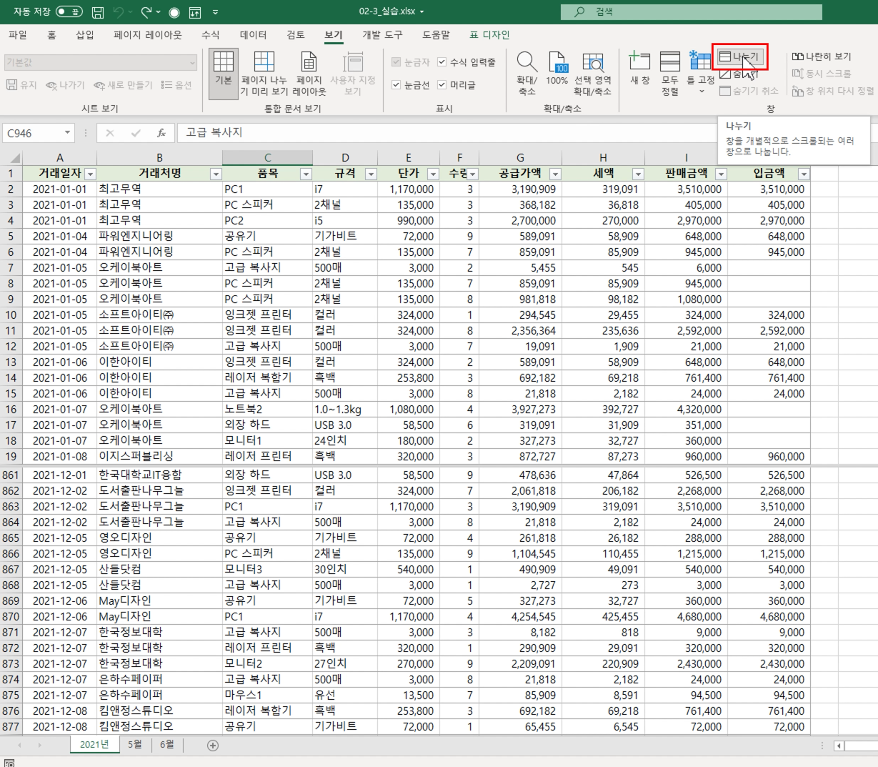 하나의 시트에 정리된 많은 양의 데이터 중 1월 거래 내역과 9월 거래 내역을 한 눈에 비교하기 쉽지 않습니다. 이 경우 창을 가로로 나누어 위쪽 창은 1월 데이터를 아래쪽 창은 9월 데이터를 볼 수 있도록 설정하면 편리합니다.