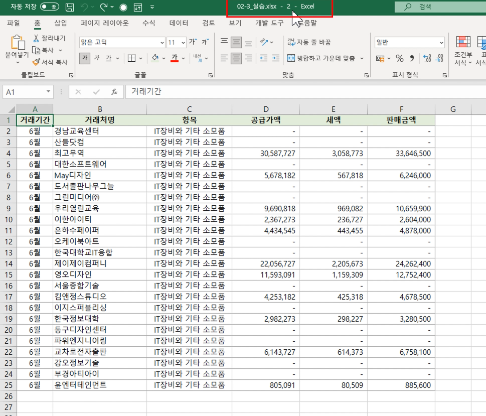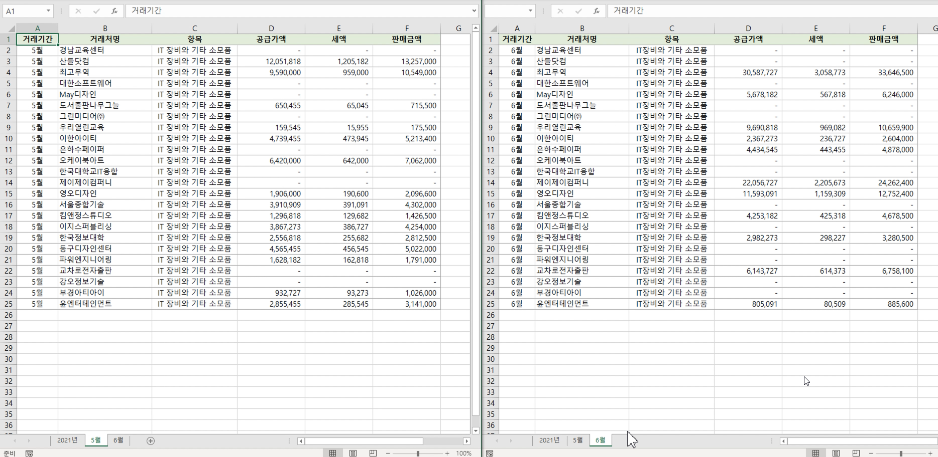 이 경우 5월 거래 내역이 왼쪽에 보이고 6월 거래 내역이 오른쪽에 보이면 아주 편리하게 데이터를 비교할 수 있습니다.