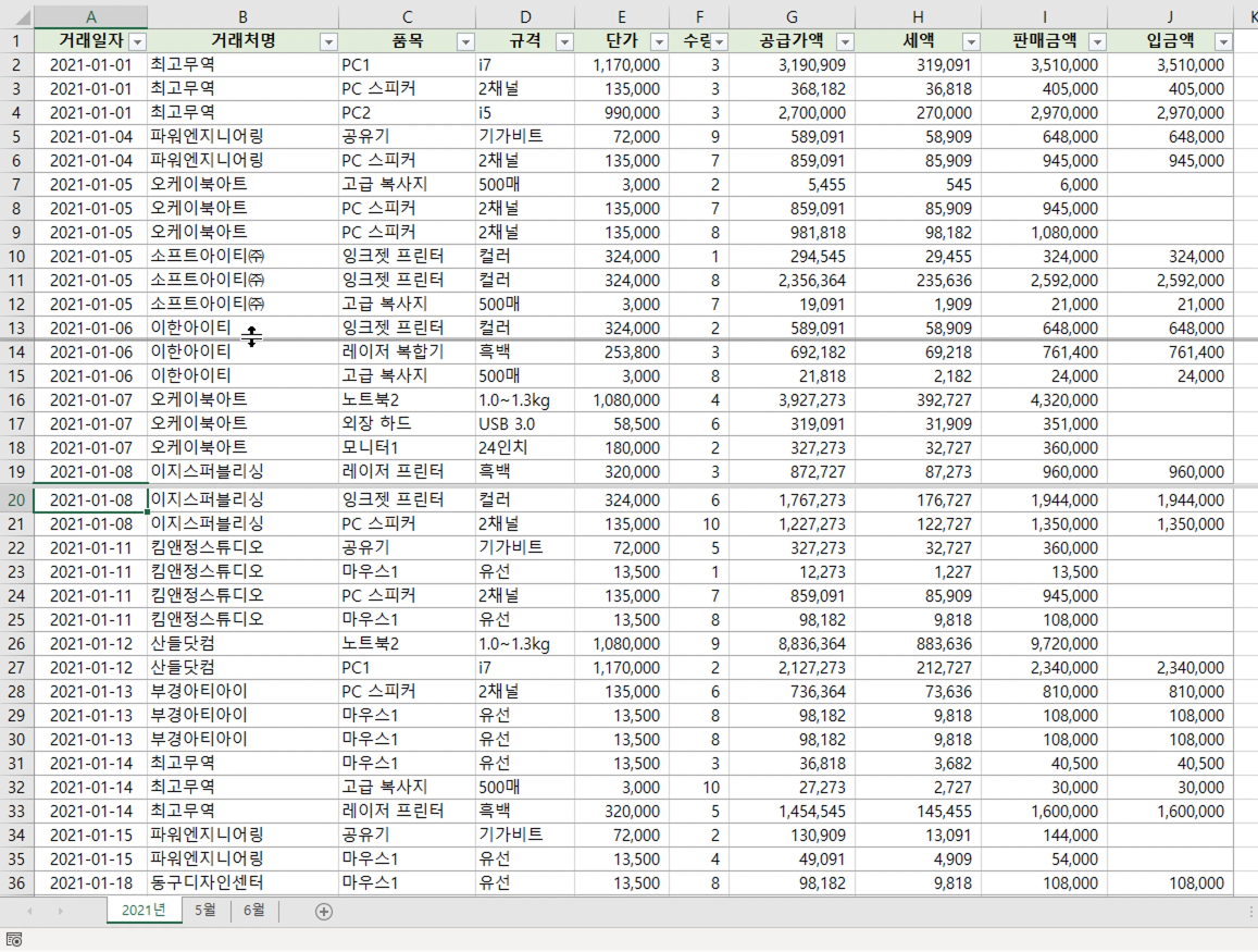5월, 6월 거래 내역을 비교할 때 5월 시트를 눌렀다가 6월 시트를 누르면 매우 불편합니다.