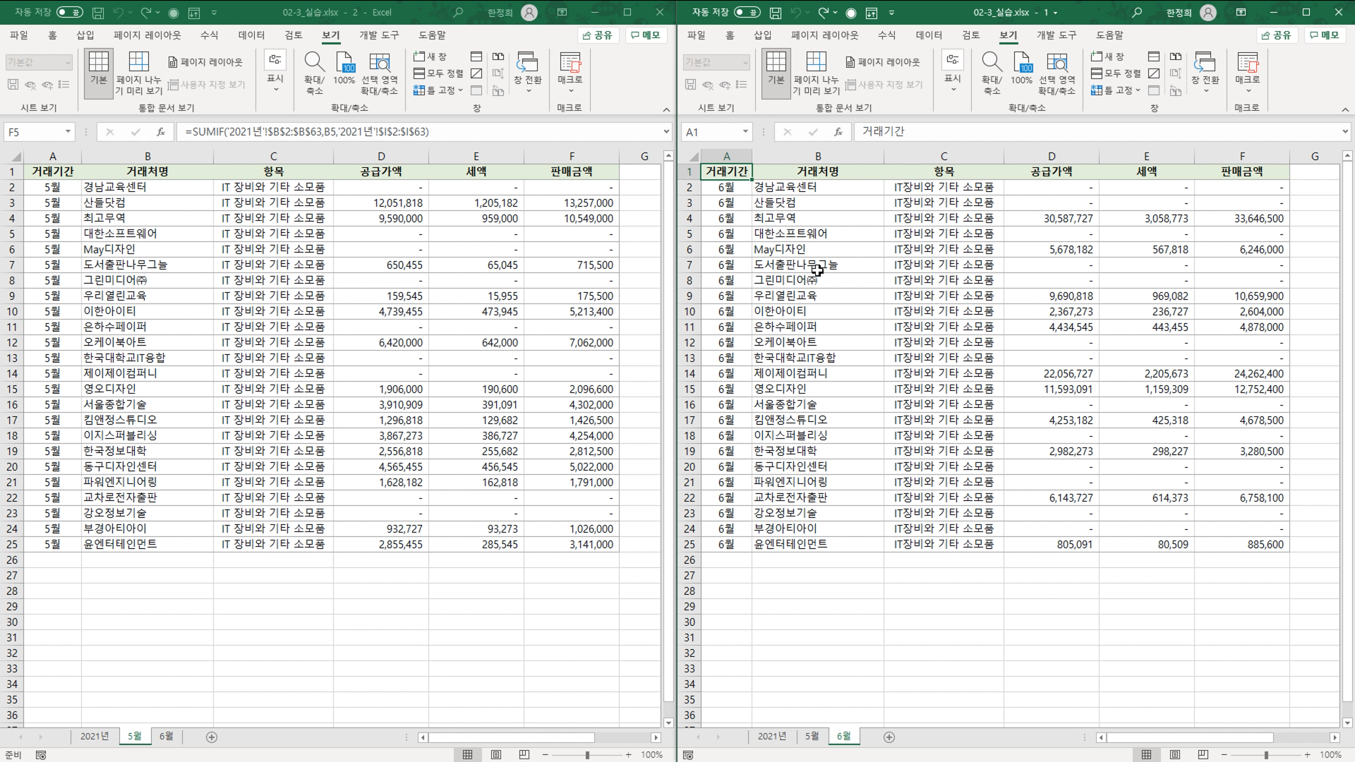 창 두개가 나란하게 배치되면 왼쪽 창은 5월 시트를 오른쪽 창은 6월 시트를 선택합니다.