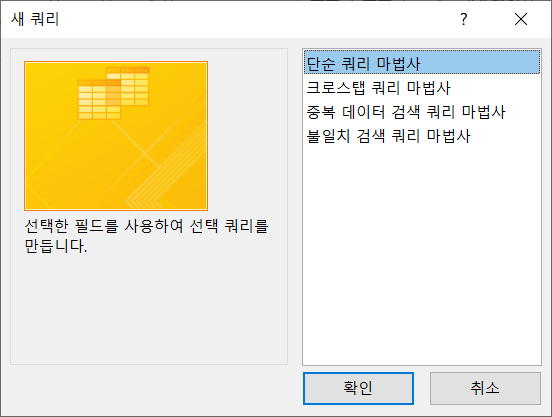 '단순 쿼리 마법사'를 선택하고 [확인]을 클릭합니다.