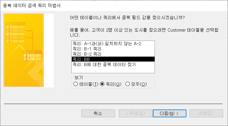 아래 '보기'에서 '쿼리'를 선택하고, 위에서 '쿼리: BB'를 선택한 뒤 [다음]을 클릭합니다.