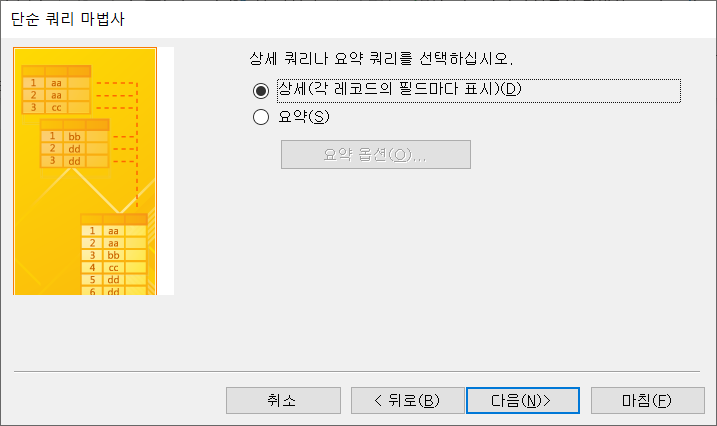 이미 선택되어 있는 '상세(각 레코드의 필드마다 표시)'가 선택된 상태에서 [다음]을 클릭합니다.