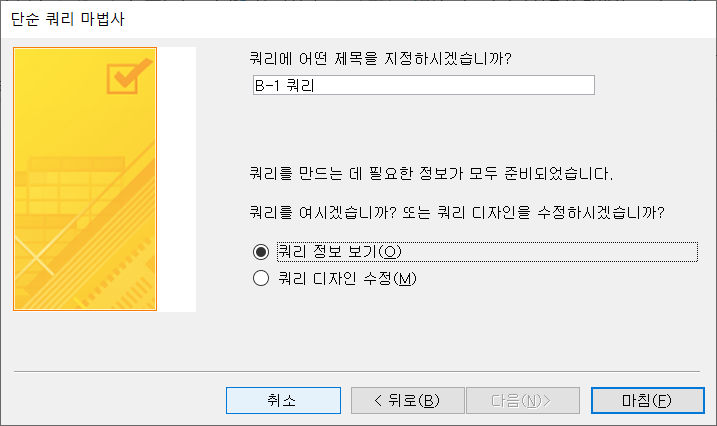 이름은 기본 이름인 'B-1 쿼리'로 두고 [마침]을 클릭합니다.