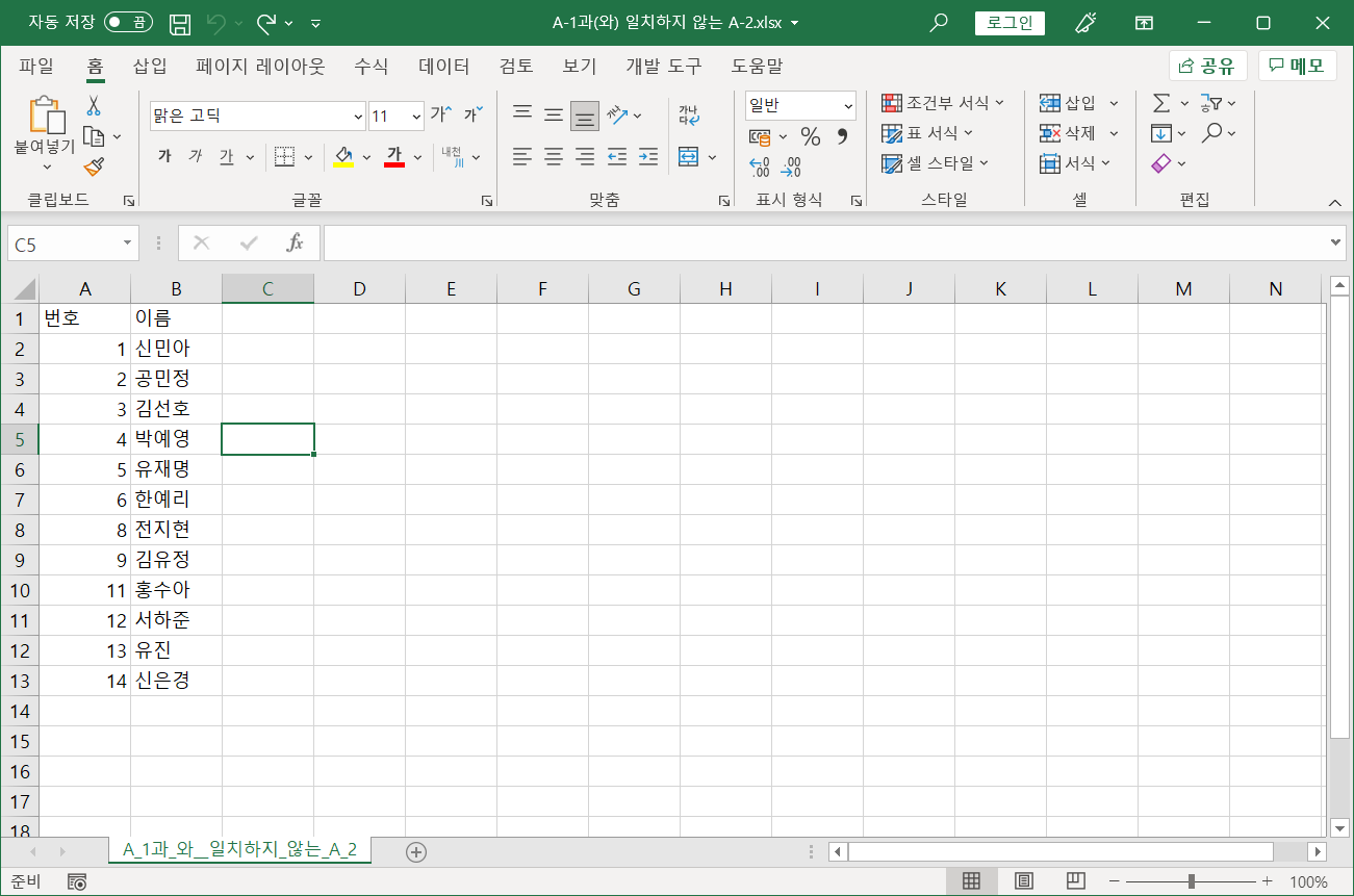 'A-1' 시트와 'A-2' 시트에 입력된 값 중 'A-2' 시트에만 있고, 'A-1' 시트에는 없는 값을 찾으려고 합니다.