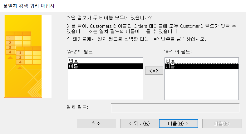 각 테이블의 필드 중 비교를 할 필드인 '이름' 필드를 각각 선택합니다.
