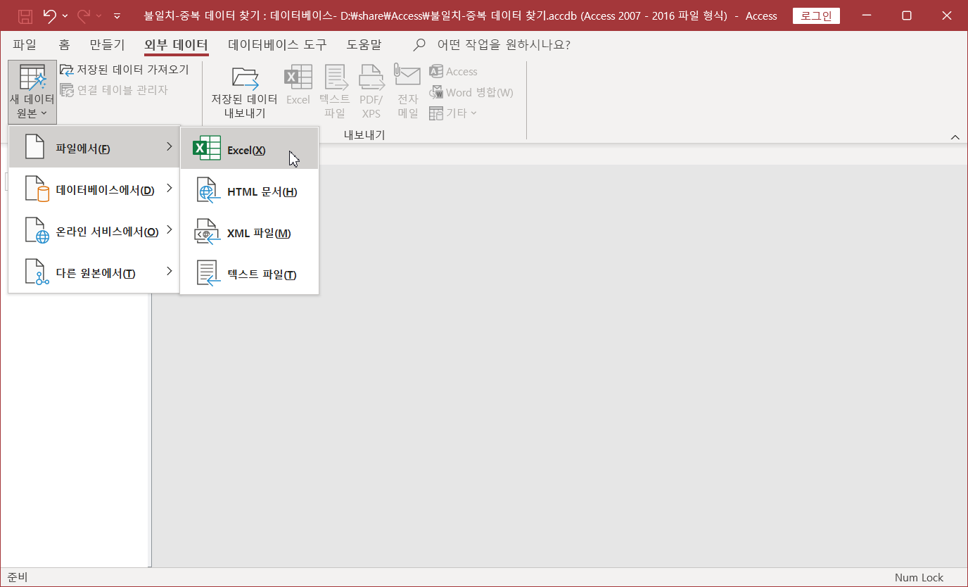 다시 [외부 데이터]-[새 데이터 원본]-[파일에서]-[Excel]을 선택합니다.