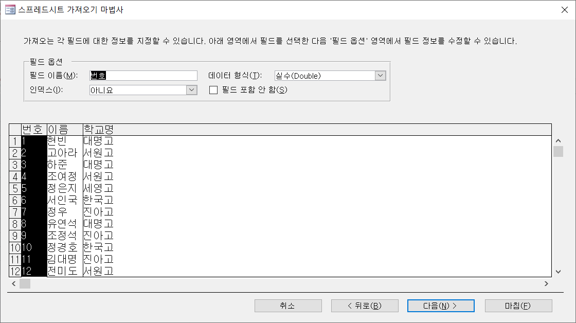 가져오는 각 필드의 데이터 형식에 대한 설정을 할 수 있는데, 수정할 내용은 없기 때문에 그냥 [다음]을 클릭합니다.