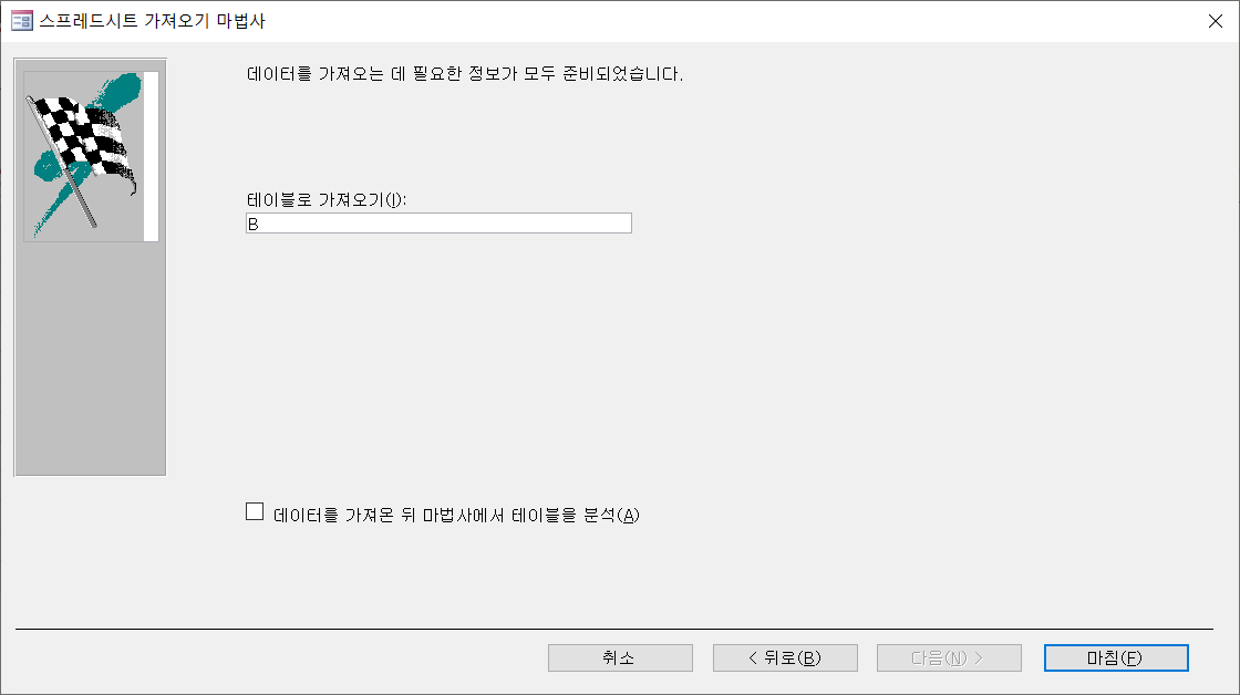 '테이블로 가져오기' 항목에서 테이블 이름을 B로 입력하고 [마침]을 클릭합니다.