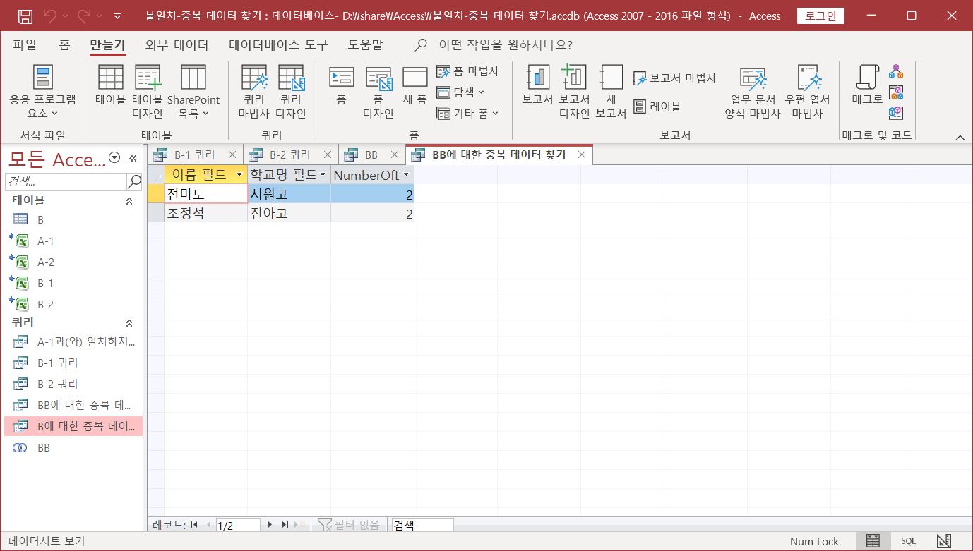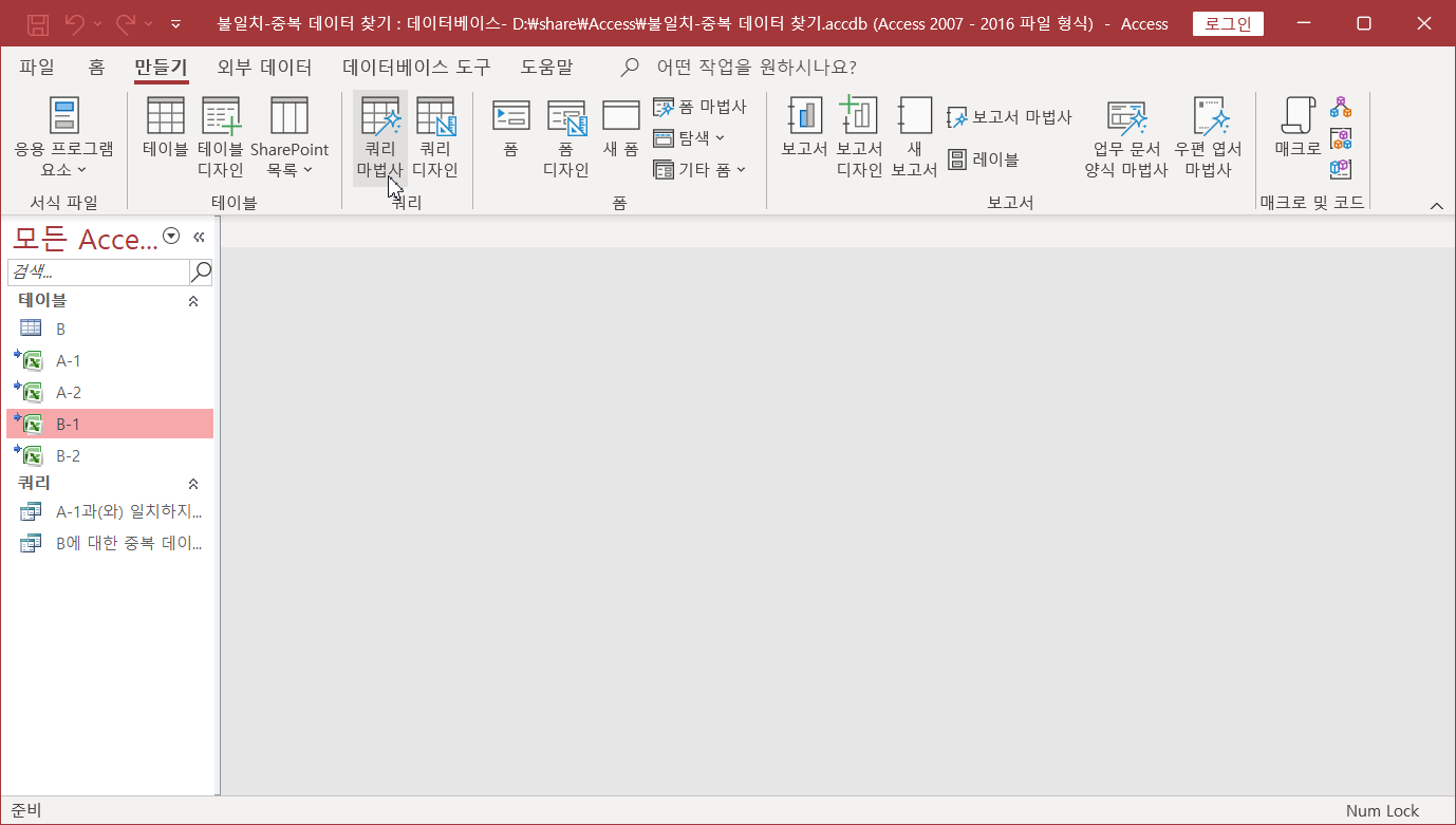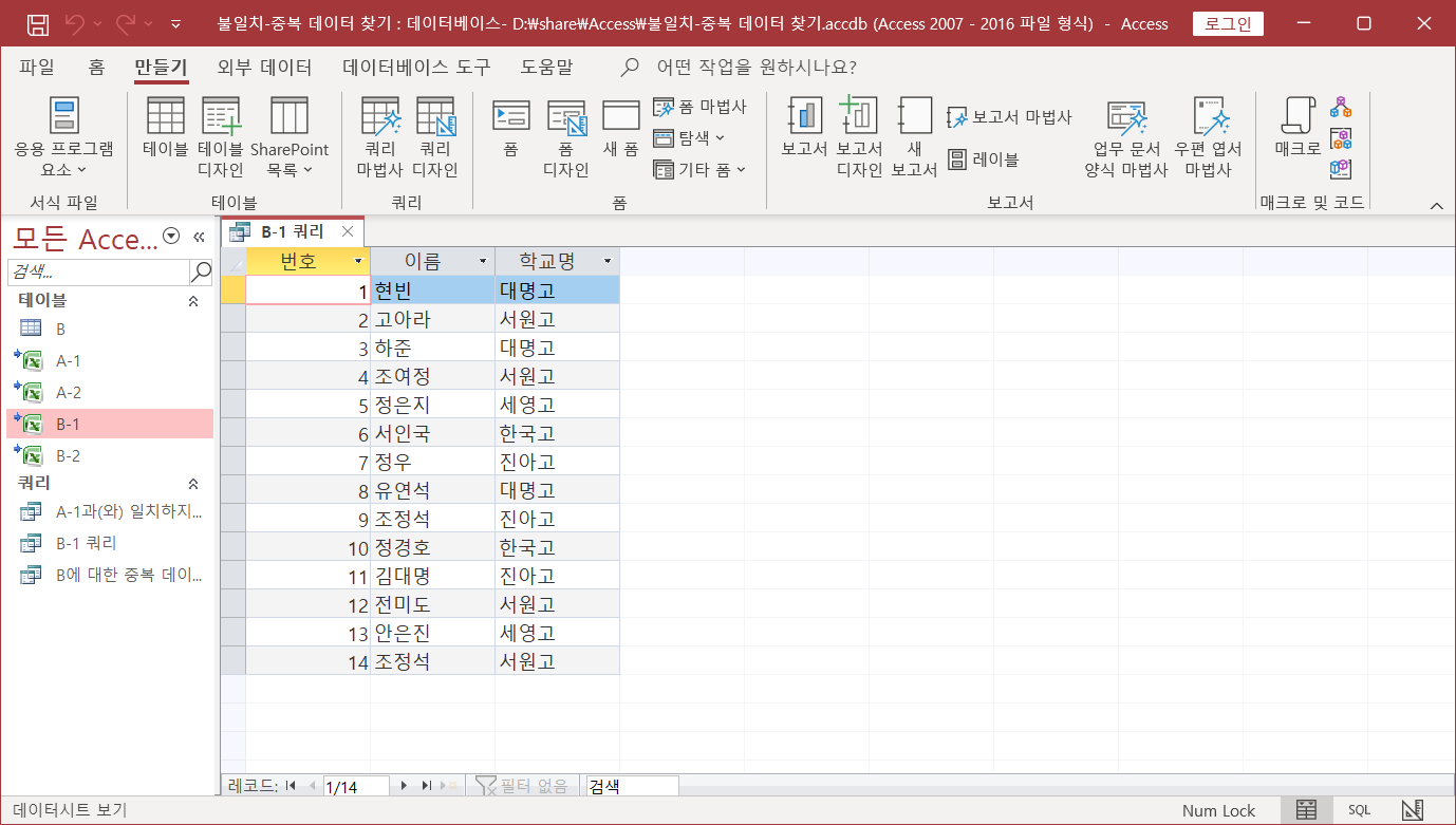 두 시트에서 불일치, 중복되는 데이터 찾기(Access 이용)