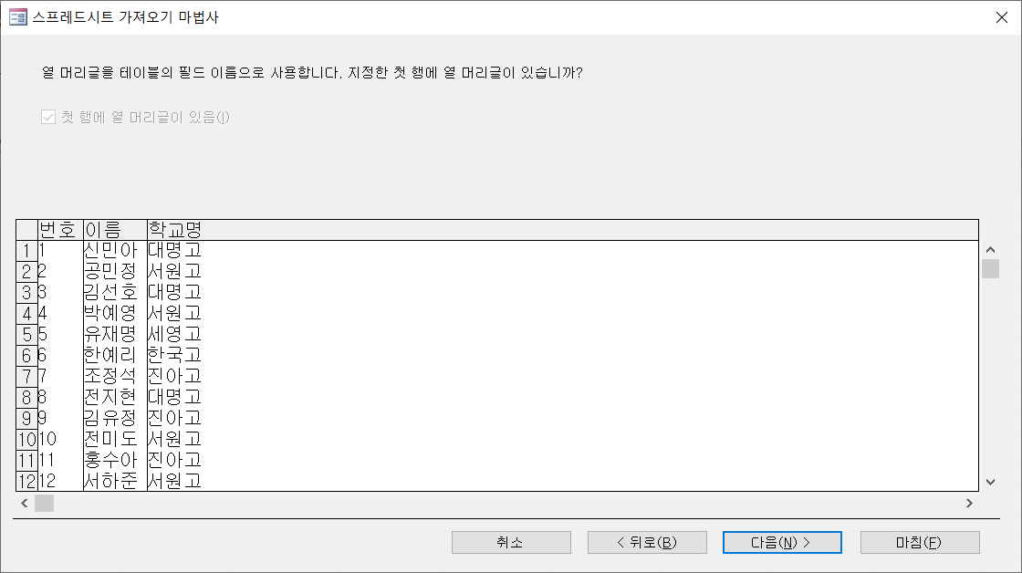 '첫 행에 열 머리글이 있음'이 선택된 상태에서 [다음]을 클릭합니다.