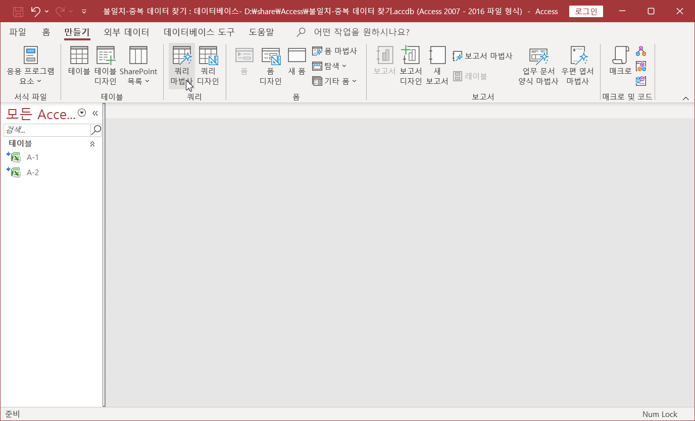 [만들기-[쿼리]-[쿼리 마법사]를 선택합니다.