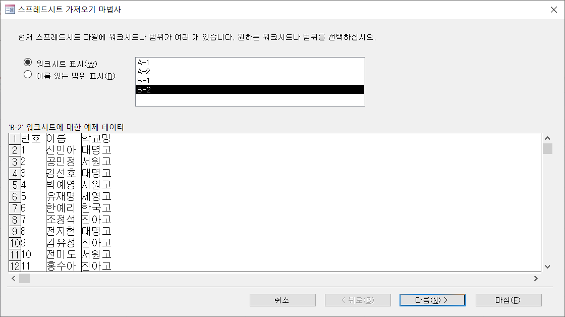 '워크시트 표시'가 선택된 상태에서 'A-2'을 선택하고 [다음]을 클릭합니다.