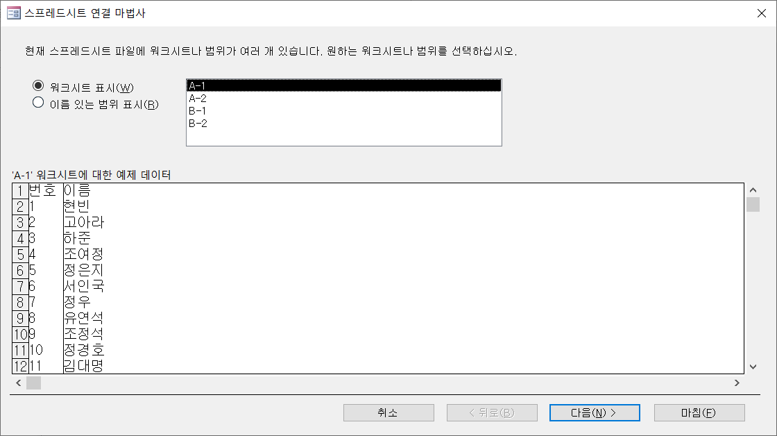 '연결 테이블 이름'은 시트 이름과 같이 'A-2'로 두고 [마침]을 클릭합니다.