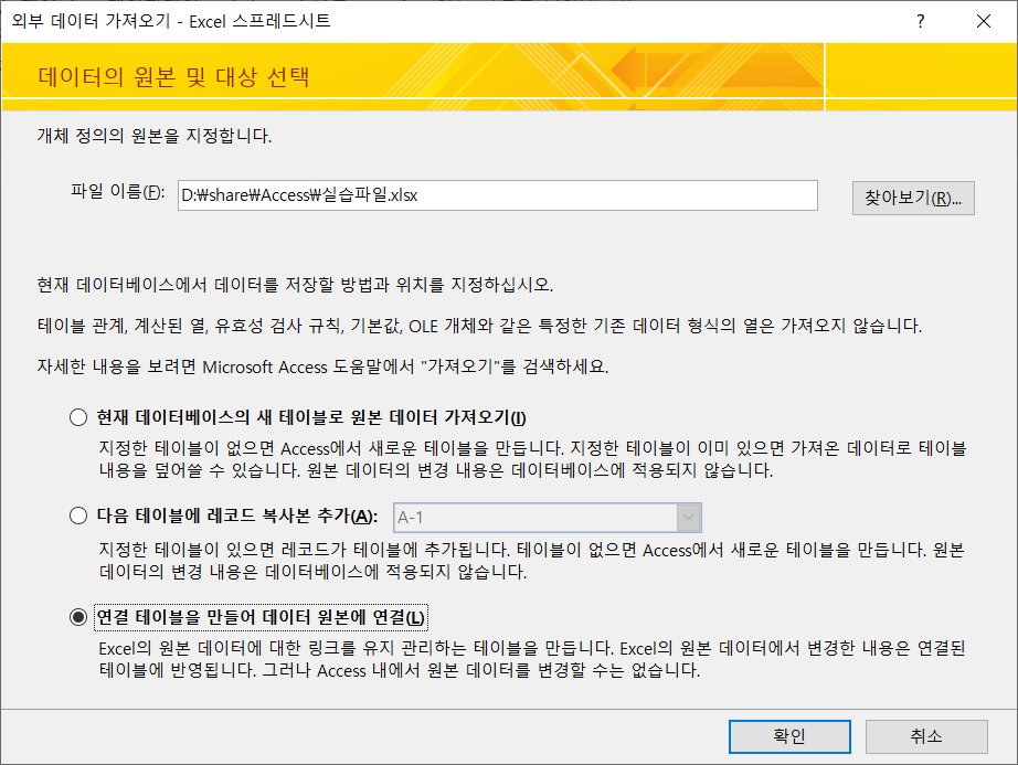 마지막 항목인 '연결 테이블을 만들어 데이터 원본에 연결'을 선택한 뒤 [확인]을 클릭합니다.