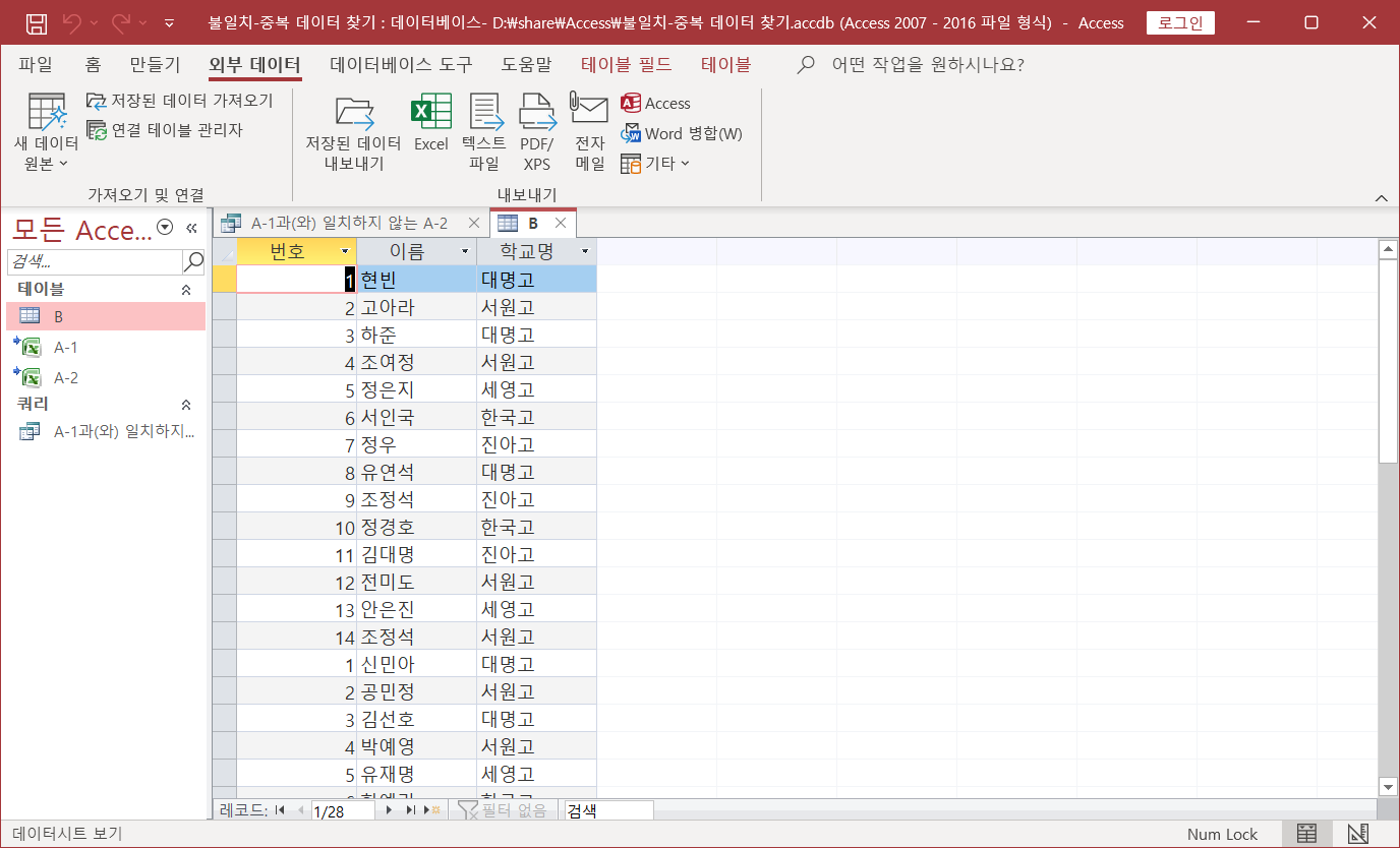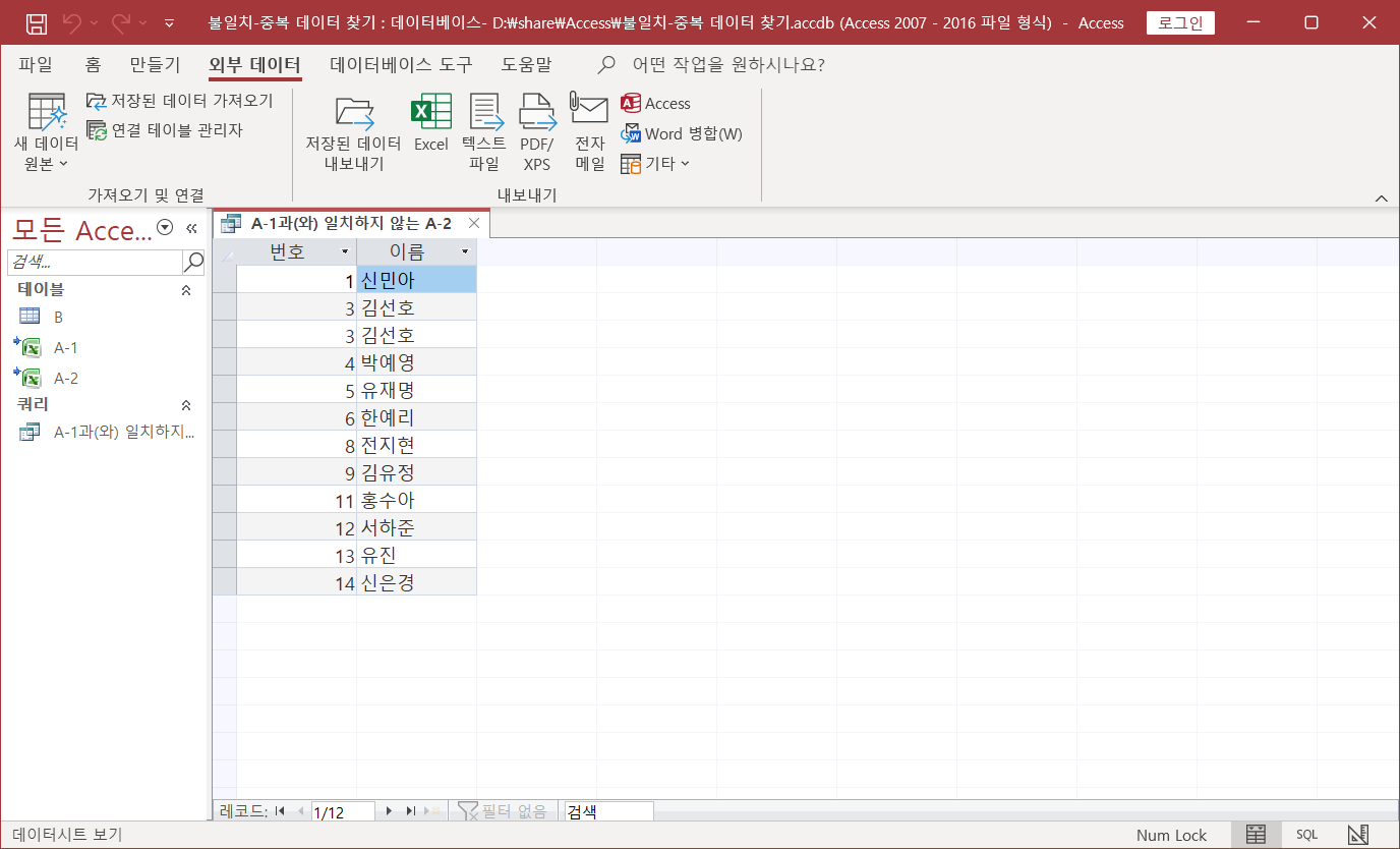 액세스 쿼리 중 [불일치 검색 쿼리]와 [중복 데이터 검색 쿼리]를 이용해 같은 결과를 구하겠습니다.