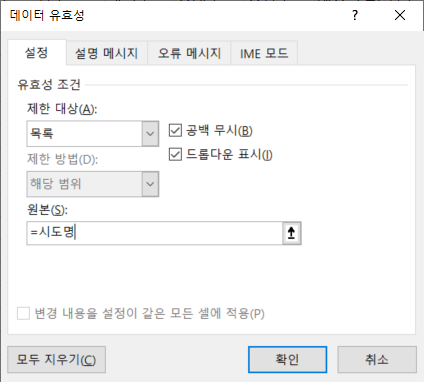 [데이터 유효성] 대화상자에서 [제한 대상]은 '목록', [원본]에는 =시도명을 입력하고 [확인]을 클릭합니다.