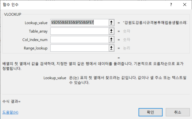 첫번째 Lookup_value 인수는 [B5], [C5], [D5], [E5], [F5], [F7] 셀을 순서대로 선택하면서 문자연결연산자 &(앰퍼센트)를 중간 중간 넣어 하나의 문자열이 되도록 입력합니다.