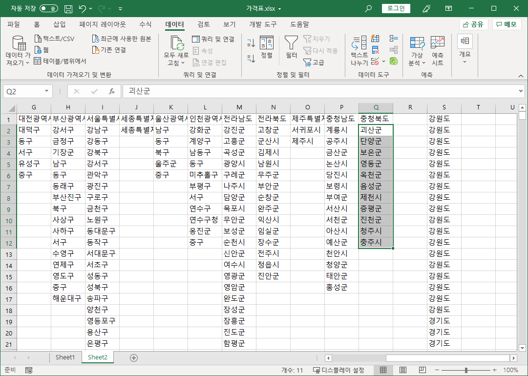 나머지 시군구명도 잘라내기해서 해당 시도명 아래 붙여넣습니다.