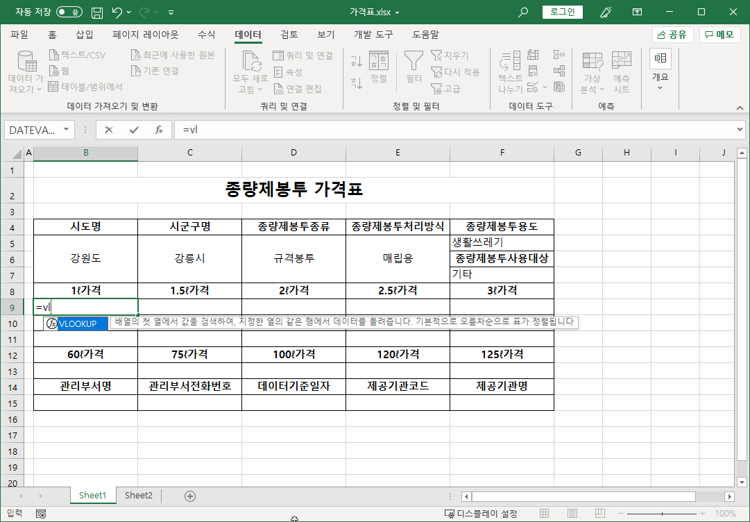 먼저 전국종량제봉투가격 파일에서 필요한 작업을 합니다.