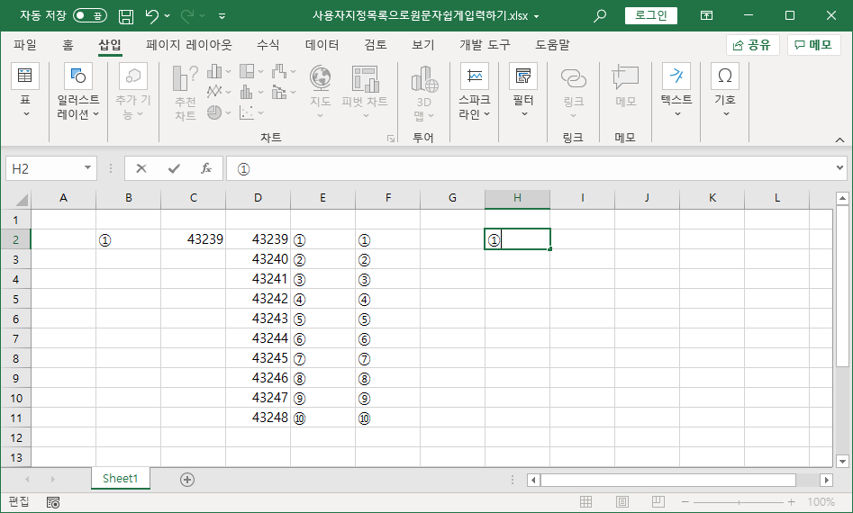 제대로 동작하는 지 확인하기 위해 [H2] 셀을 선택하고 [삽입]-[기호]를 선택하고 원문자 ①을 나타냅니다.