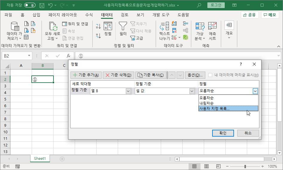 두번째는 [데이터]-[정렬 및 필터]-[정렬]을 선택하고, [정렬] 대화상자에서 '정렬' 항목을 눌러 '사용자 지정 목록'을 눌러 등록하는 방법입니다.
