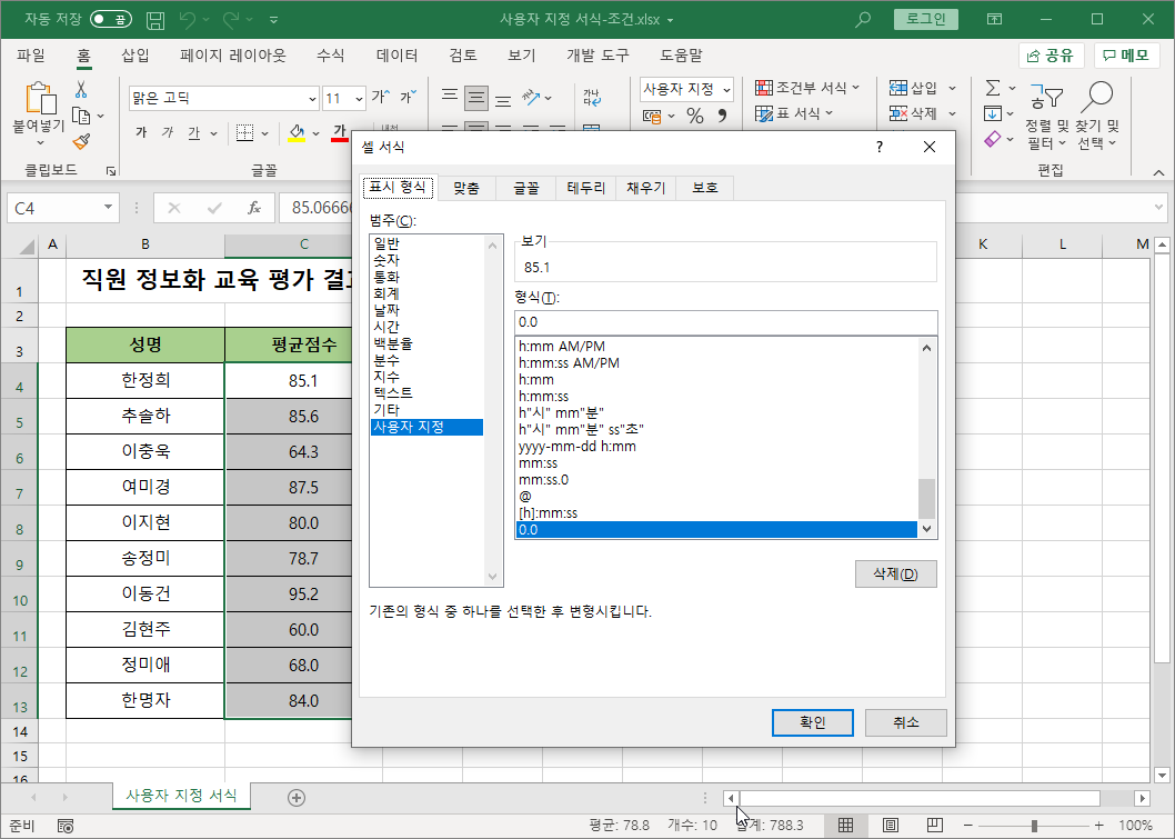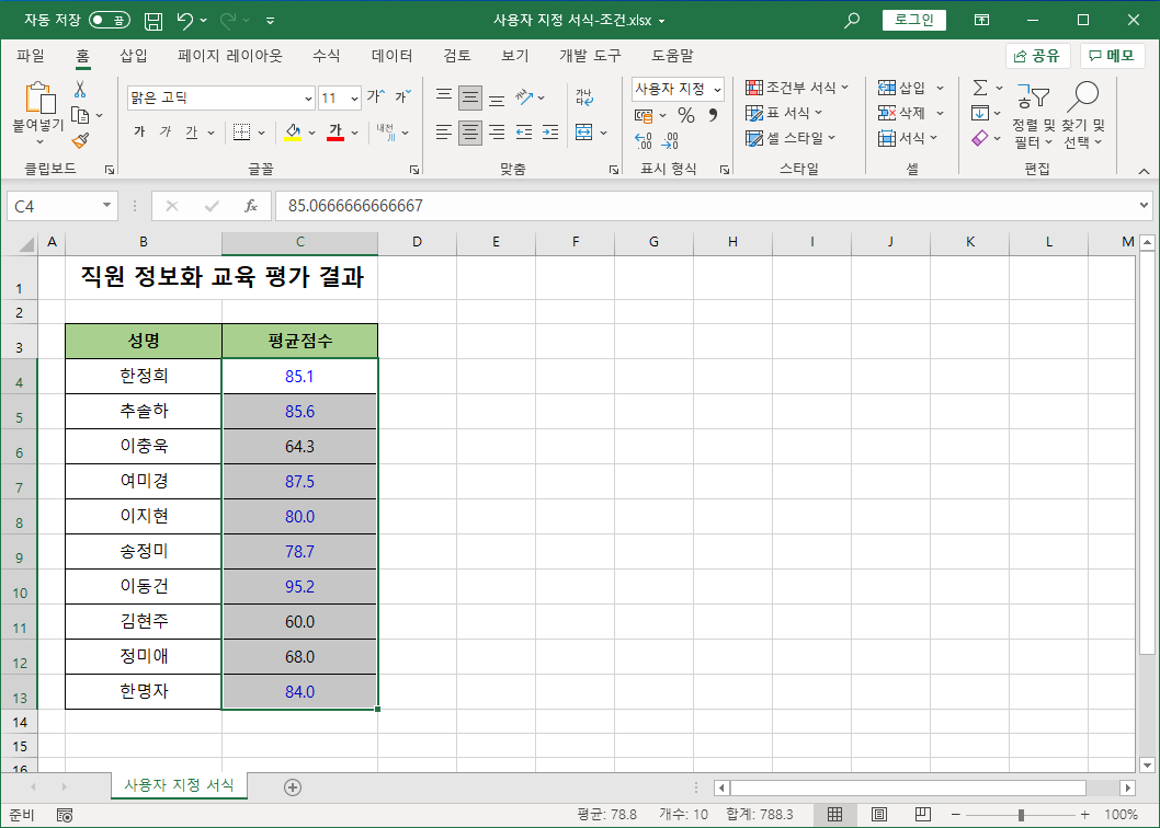 평균점수가 70점 이상인 경우 글자색을 '파랑'으로 나타내는 사용자 지정 서식을 설정합니다.