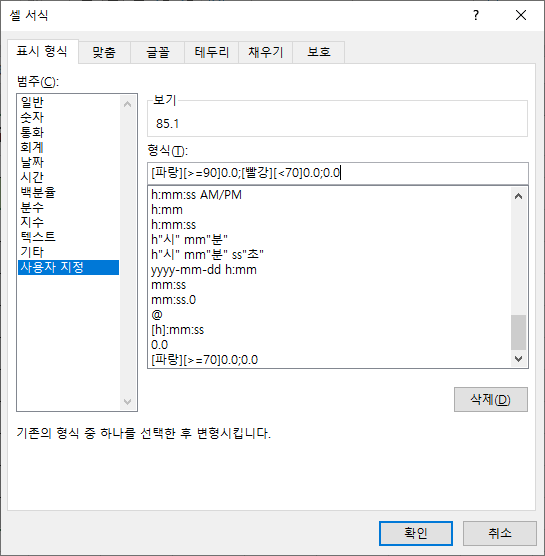 사용자 지정 서식에서 조건을 지정하는 방법은 단순합니다.