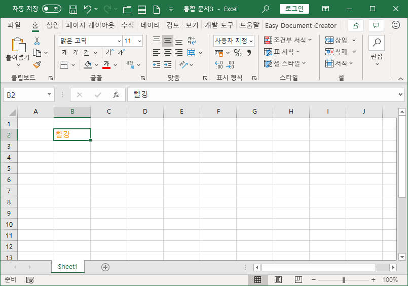 '빨강'이 적혀 있는 [B3] 셀에 사용자 지정 서식으로 글자색을 빨강으로 나타냅니다.