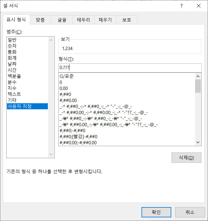 표시 형식 탭에서 사용자 지정 범주를 선택하고, 형식에 0.???를 입력합니다.