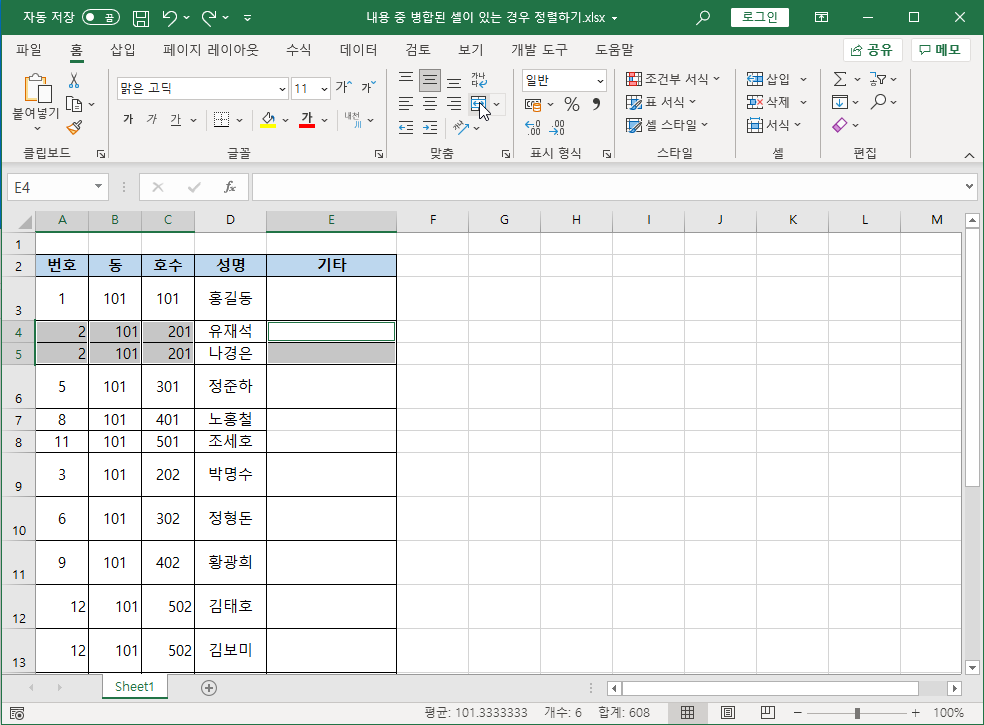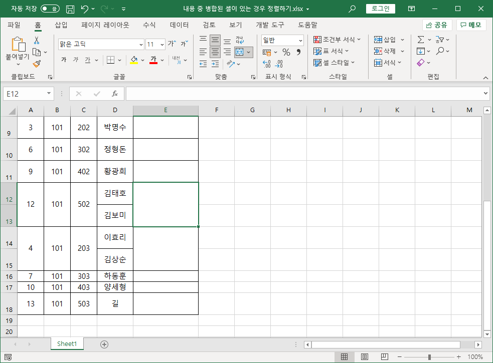 서식은 좀 있다 처리하기로 하고, 먼저 정렬하기 위해서는 병합이 해제되어 새로 표시된 빈 셀을 채워야 합니다.