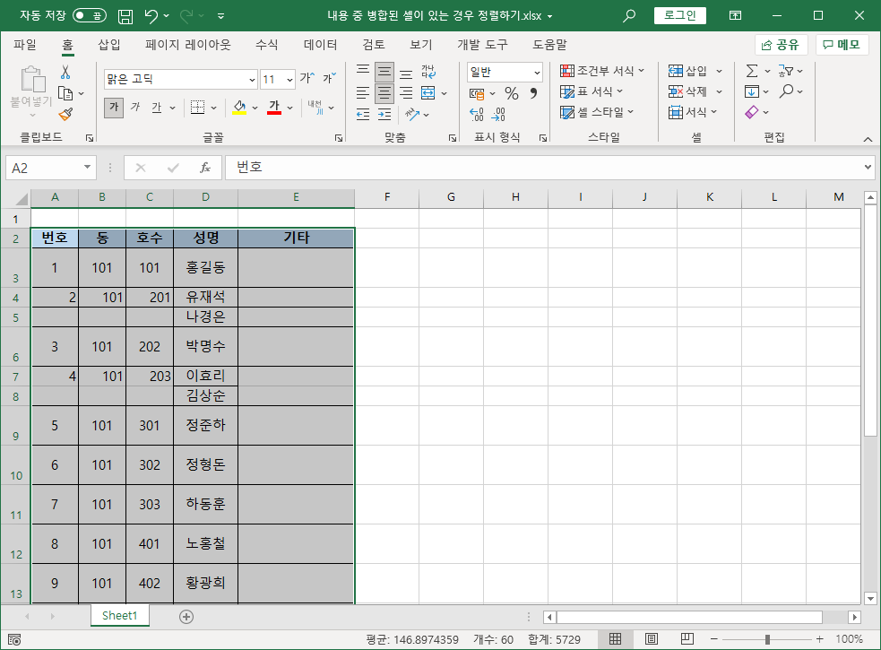 문서를 만들 때 엑셀 기능을 고려하지 않고 예전에 만들던 모양 그대로 만드는 경우가 있는데, 지금 예제와 같은 내용 중 병합이 되어 있는 경우나 제목이 병합되어 있는 경우가 있습니다.